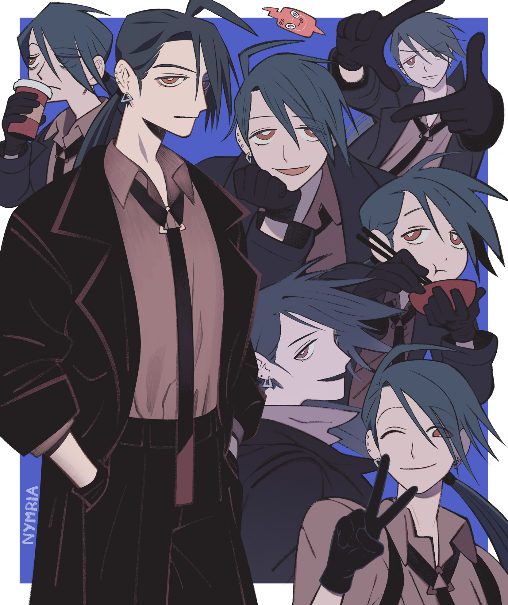 1girl ahoge black_coat black_gloves black_necktie bowl bright_pupils chopsticks coat coffee collared_shirt cup disposable_coffee_cup disposable_cup earrings eating gen_4_pokemon gloves green_hair grey_shirt highres holding holding_bowl holding_chopsticks jewelry long_hair multiple_piercings multiple_views necktie nintendo nymria one_eye_closed pokemon pokemon_scarlet_and_violet ponytail red_eyes reverse_trap rika_(pokemon) rotom rotom_phone shirt suspenders tomboy v white_pupils
