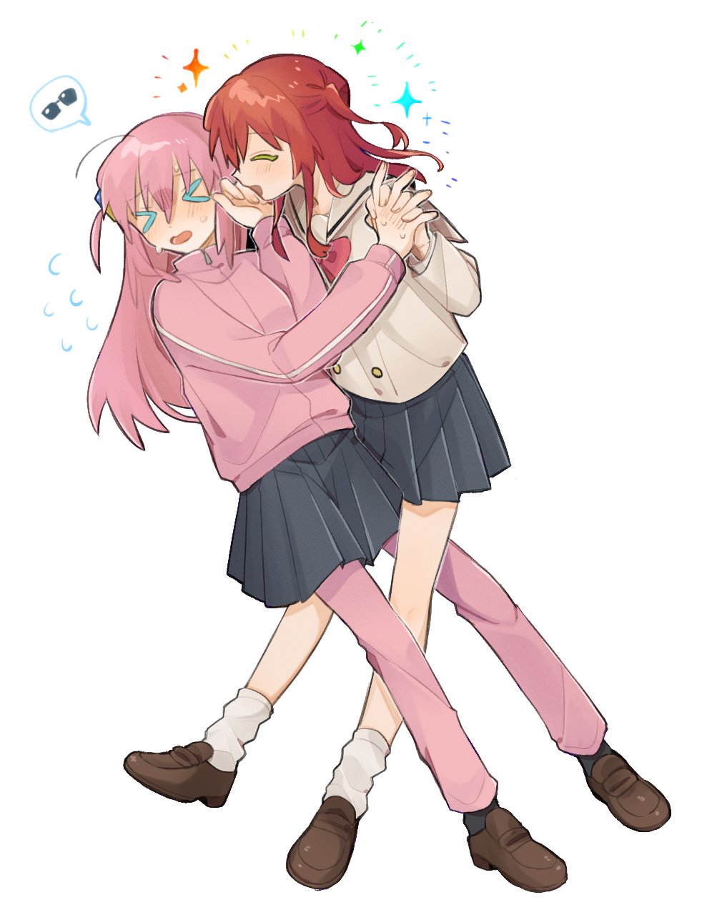>_< 2girls black_socks blazer bocchi_the_rock! bow brown_footwear brown_jacket cube_hair_ornament glitter gotoh_hitori grey_skirt hair_between_eyes hair_ornament hair_over_eyes highres holding_another's_wrist holding_hands jacket kita_ikuyo lifting_person light_particles loafers long_hair long_sleeves looking_at_another looking_away loose_socks multiple_girls one_side_up open_mouth paint pants pants_under_skirt pink_hair pink_jacket pink_pants pinkroll1280 pleated_skirt red_bow red_hair sailor_collar school_uniform shoes simple_background skirt smile socks track_jacket white_background white_sailor_collar white_socks