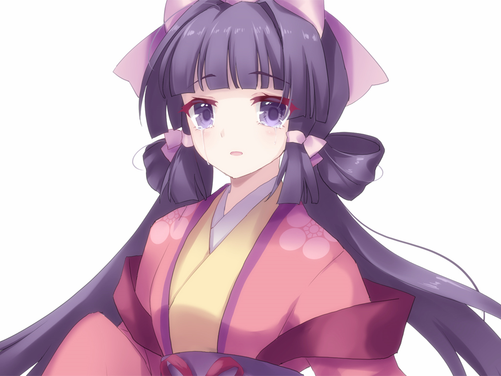 1girl akinomiya_asuka blunt_bangs blush commentary_request crying crying_with_eyes_open hair_ribbon haori japanese_clothes kimono long_hair long_sleeves mystical_power_plant obi original parted_lips pink_ribbon purple_eyes purple_hair ribbon sash simple_background solo tears touhou upper_body white_background yaezaki_an yellow_kimono