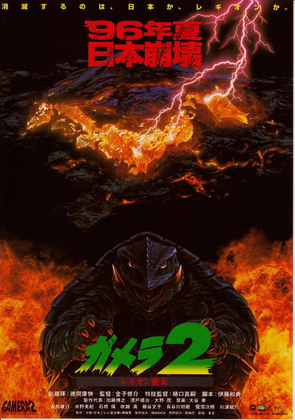 apocalypse artist_request claws country daiei_film electricity energy explosion fire gamera gamera_(series) gamera_2:_attack_of_legion green_eyes island japan japanese_text kaiju lightning monster movie_poster_(medium) ocean official_art sea_monster shell turtle turtle_shell tusks