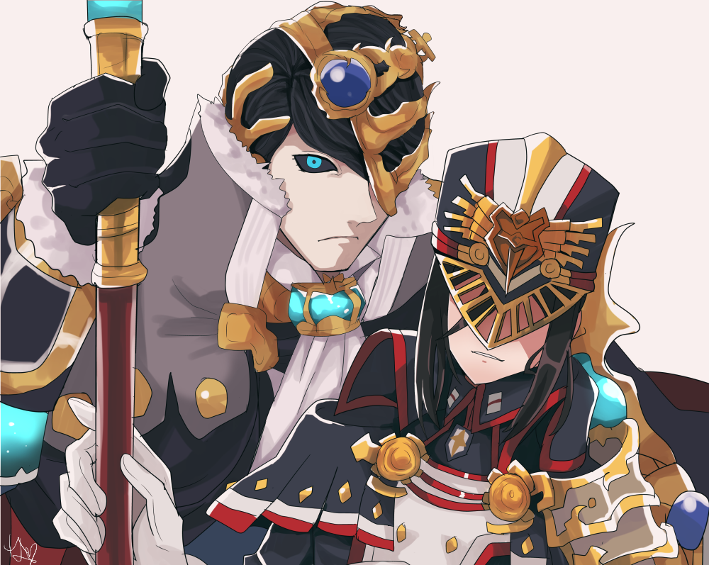 1boy 1girl :d black_coat black_gloves black_sclera blue_eyes brown_hair closed_mouth coat colored_sclera dagas_(xenoblade) gloves hat holding holding_polearm holding_weapon long_sleeves looking_at_viewer military military_hat military_uniform morag_ladair_(xenoblade) open_mouth polearm rem_(eyes_410) shaded_face simple_background smile upper_body weapon white_background white_gloves xenoblade_chronicles_(series) xenoblade_chronicles_2