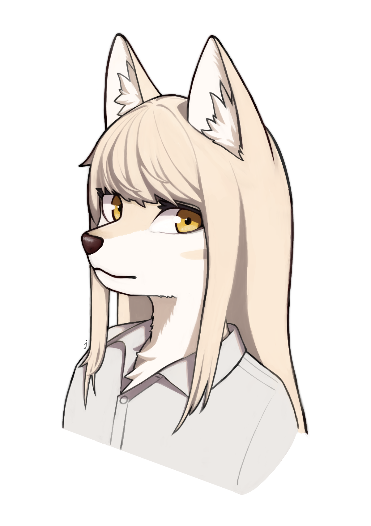 1girl :3 animal_ear_fluff animal_ears animal_nose artist_name blonde_hair body_fur buttons closed_mouth collared_shirt facial_mark female_focus fox_ears fox_girl furry furry_female grey_shirt highres jeifier_(character) jeifier_(korfiorano01) long_hair looking_at_viewer original portrait shirt sidelocks signature simple_background snout solo swept_bangs two-tone_fur white_background white_fur yellow_eyes yellow_fur