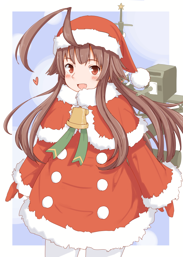 1girl ahoge aji_(ajinohirakisan) bell brown_hair capelet cowboy_shot dress fur-trimmed_capelet fur-trimmed_dress fur-trimmed_headwear fur_trim green_ribbon hat huge_ahoge kantai_collection kuma_(christmas)_(kancolle) kuma_(kancolle) long_hair official_alternate_costume pantyhose red_capelet red_eyes red_hat ribbon rigging santa_costume santa_dress santa_hat smile solo standing white_pantyhose