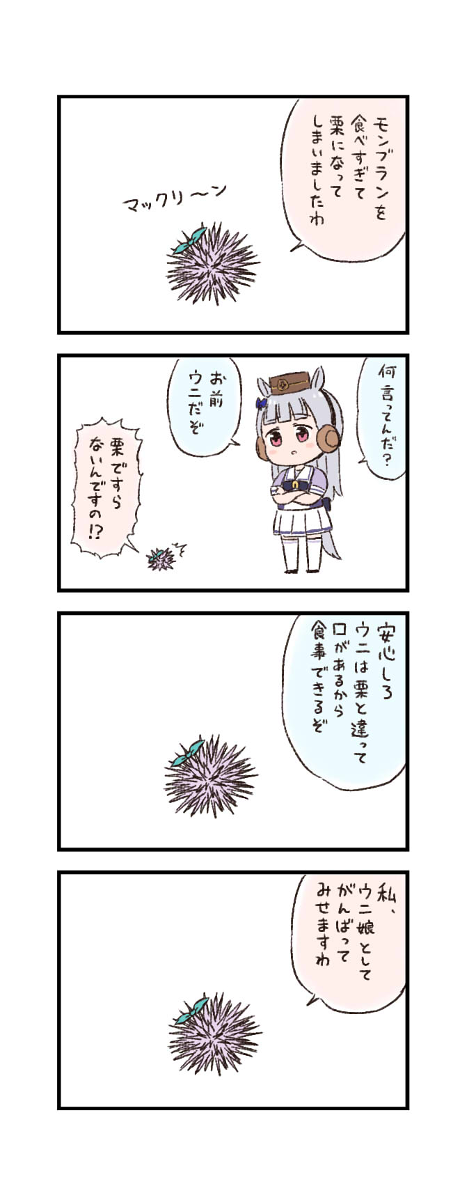 2girls 4koma animal_ears batta_(ijigen_debris) blush chibi comic crossed_arms gold_ship_(umamusume) hat highres horse_ears mejiro_mcqueen_(umamusume) multiple_girls paku_paku_desuwa pink_eyes school_uniform sea_urchin smile tracen_school_uniform translated umamusume white_background