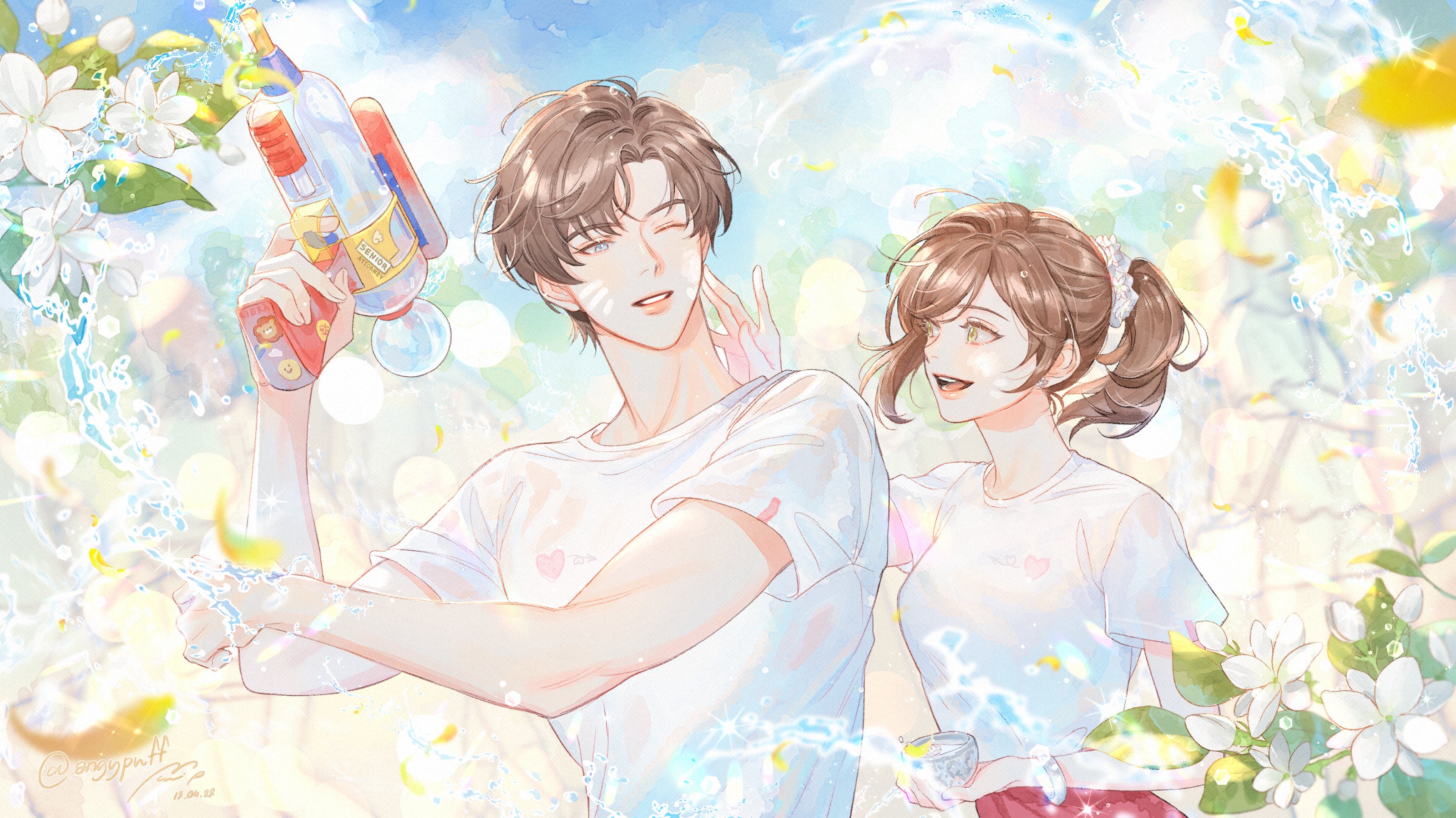 1boy 1girl :d absurdres angypuff artem_wing_(tears_of_themis) blue_sky brown_hair cloud cloudy_sky flower hair_bun highres holding one_eye_closed open_mouth outdoors ponytail rosa_(tears_of_themis) shirt short_hair short_sleeves single_hair_bun sky smile tears_of_themis water water_gun white_flower white_shirt