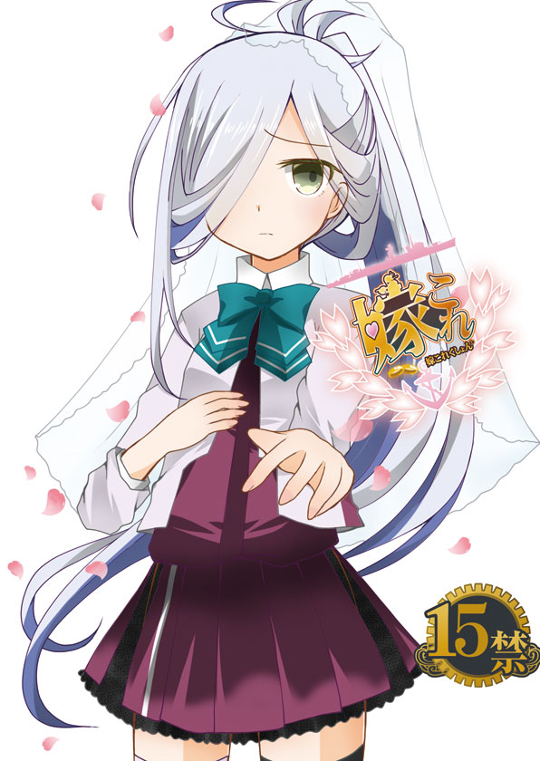 1girl ahoge aqua_bow aqua_bowtie asashimo_(kancolle) asashimo_kai_ni_(kancolle) blazer bow bowtie bridal_veil commentary_request cowboy_shot dress gradient_hair grey_eyes grey_hair hair_over_one_eye inscco jacket kantai_collection long_hair looking_at_viewer multicolored_hair pleated_dress ponytail purple_dress school_uniform second-party_source simple_background solo standing thighhighs veil white_background