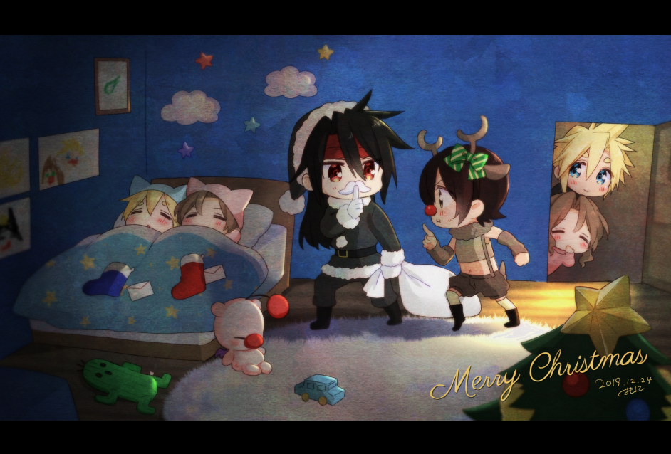 3boys 3girls aerith_gainsborough alternate_costume animal_ear_headwear animal_ears antlers artist_name bad_id bad_pixiv_id black_hair black_headwear black_jacket black_pants blonde_hair blue_eyes bow brother_and_sister brown_hair chibi child christmas closed_eyes cloud_strife crop_top dated drawing fake_animal_ears fake_facial_hair fake_mustache final_fantasy final_fantasy_vii finger_to_mouth fur_trim green_bow hair_between_eyes hair_bow hat horns if_they_mated indoors jacket krudears leaning_forward long_hair merry_christmas moogle multiple_boys multiple_girls on_bed pants parent_and_child red_eyes red_nose reindeer_antlers rug sabotender santa_hat short_hair siblings sleeping spiked_hair striped_bow toy_car under_covers vincent_valentine yuffie_kisaragi