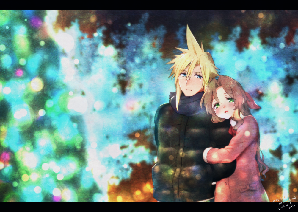 1boy 1girl aerith_gainsborough alternate_costume artist_name bad_id bad_pixiv_id black_coat blonde_hair blue_eyes blue_scarf blush brown_hair christmas_lights cloud_strife coat couple dated final_fantasy final_fantasy_vii final_fantasy_vii_remake green_eyes hair_between_eyes hair_ribbon hetero holding_another's_arm krudears letterboxed long_hair looking_at_viewer parted_lips pink_coat pink_ribbon ribbon scarf short_hair smile spiked_hair square_enix upper_body winter_clothes