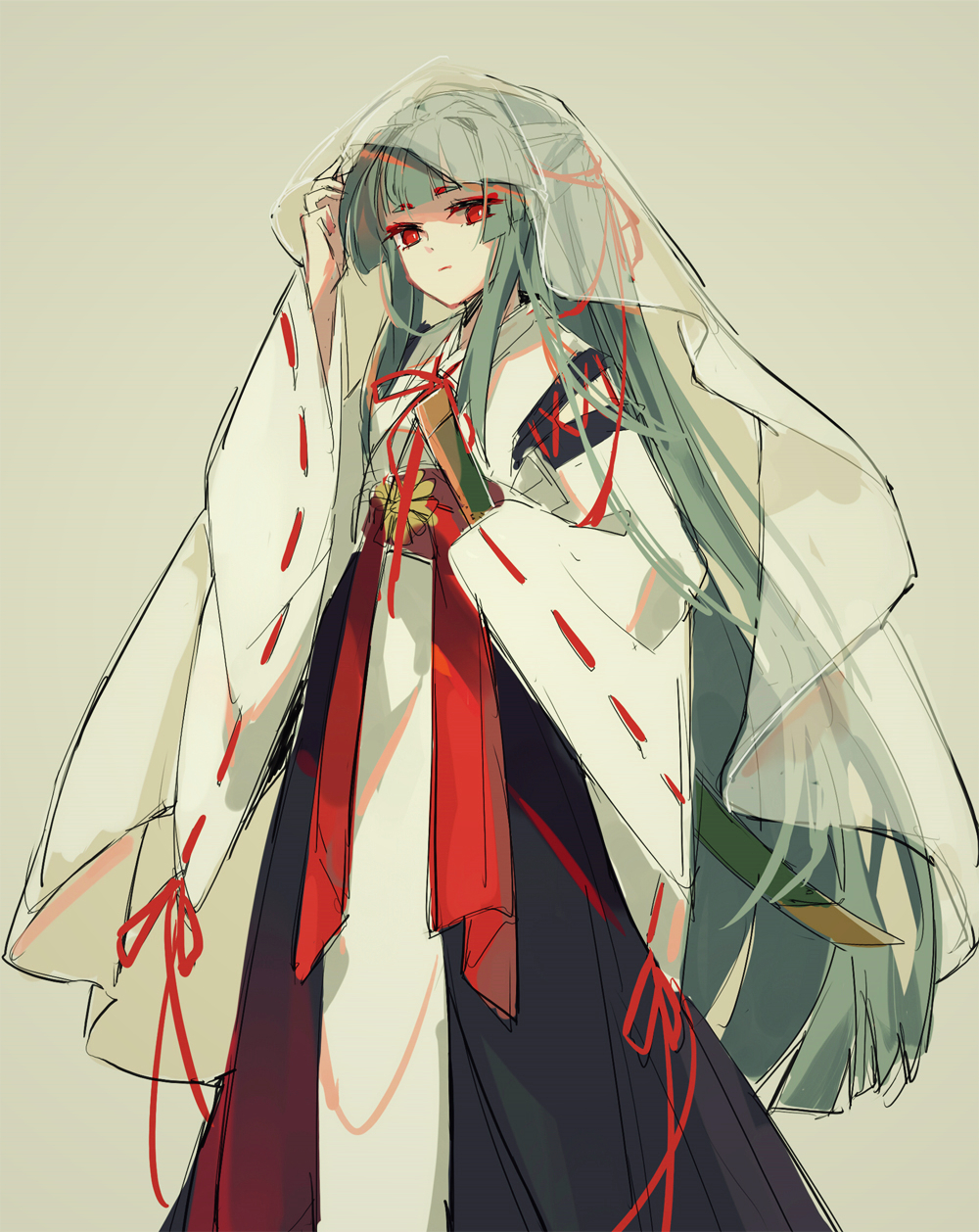 1girl akinomiya_asuka blunt_bangs bright_pupils closed_mouth commentary_request detached_sleeves green_hair highres japanese_clothes kimono long_hair long_sleeves mystical_power_plant obi original red_eyes sash simple_background sketch solo suitokuin_tenmu tasuki touhou veil very_long_hair white_kimono white_pupils white_sleeves wide_sleeves yellow_background