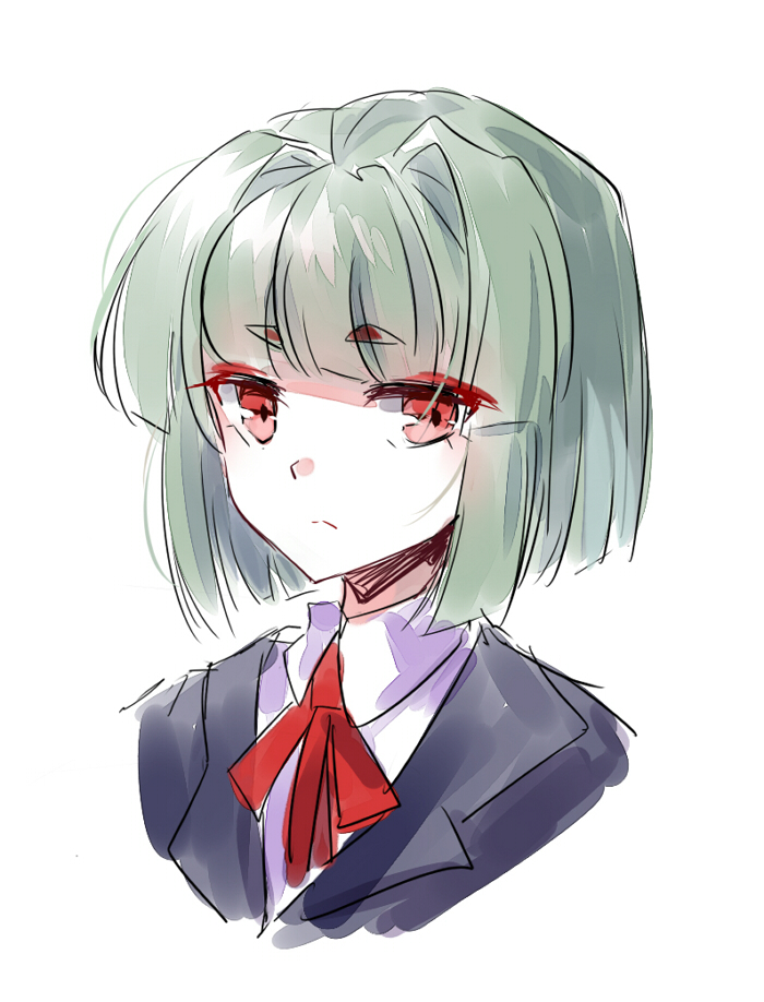 1girl akinomiya_asuka alternate_hair_length alternate_hairstyle black_jacket blunt_bangs closed_mouth collared_shirt commentary_request frown green_hair hair_intakes jacket mystical_power_plant neck_ribbon original portrait red_eyes red_ribbon ribbon shirt short_hair simple_background sketch solo suitokuin_tenmu touhou white_background white_shirt