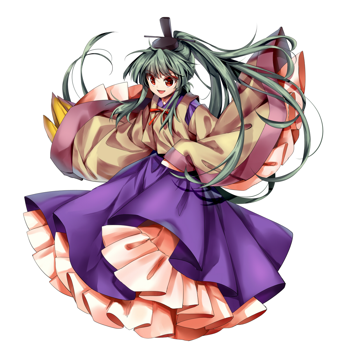 1girl akinomiya_asuka black_hat commentary_request detached_sleeves frilled_kimono frilled_sleeves frills full_body green_eyes green_hair harukawa_moe_(style) hat highres japanese_clothes kariginu kimono long_hair mystical_power_plant open_mouth original ponytail purple_kimono red_eyes red_ribbon ribbon simple_background smile solo suitokuin_tenmu tachi-e tate_eboshi touhou white_background wide_sleeves