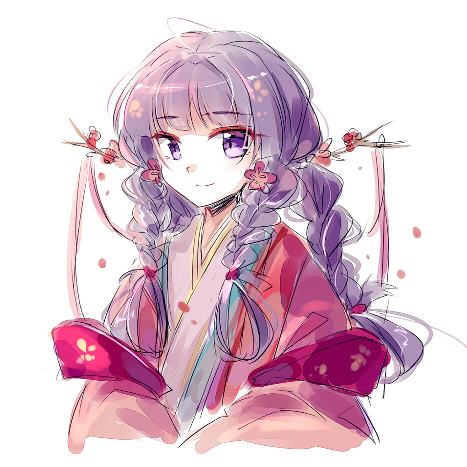 akinomiya_asuka alternate_hairstyle blunt_bangs braid closed_mouth commentary_request flower hair_flower hair_ornament haori japanese_clothes kimono long_hair long_sleeves mystical_power_plant original pink_flower pink_kimono portrait purple_eyes purple_hair simple_background sketch smile touhou twin_braids white_background yaezaki_an