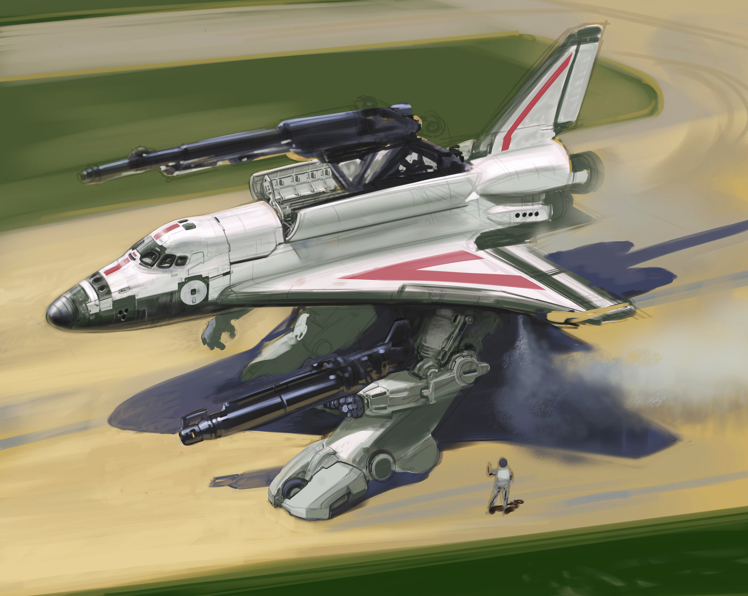1other cannon frye_(fryewerk) gerwalk gun highres holding holding_gun holding_weapon mecha open_mouth original robot science_fiction sketch smoke solo space_shuttle spacecraft standing weapon