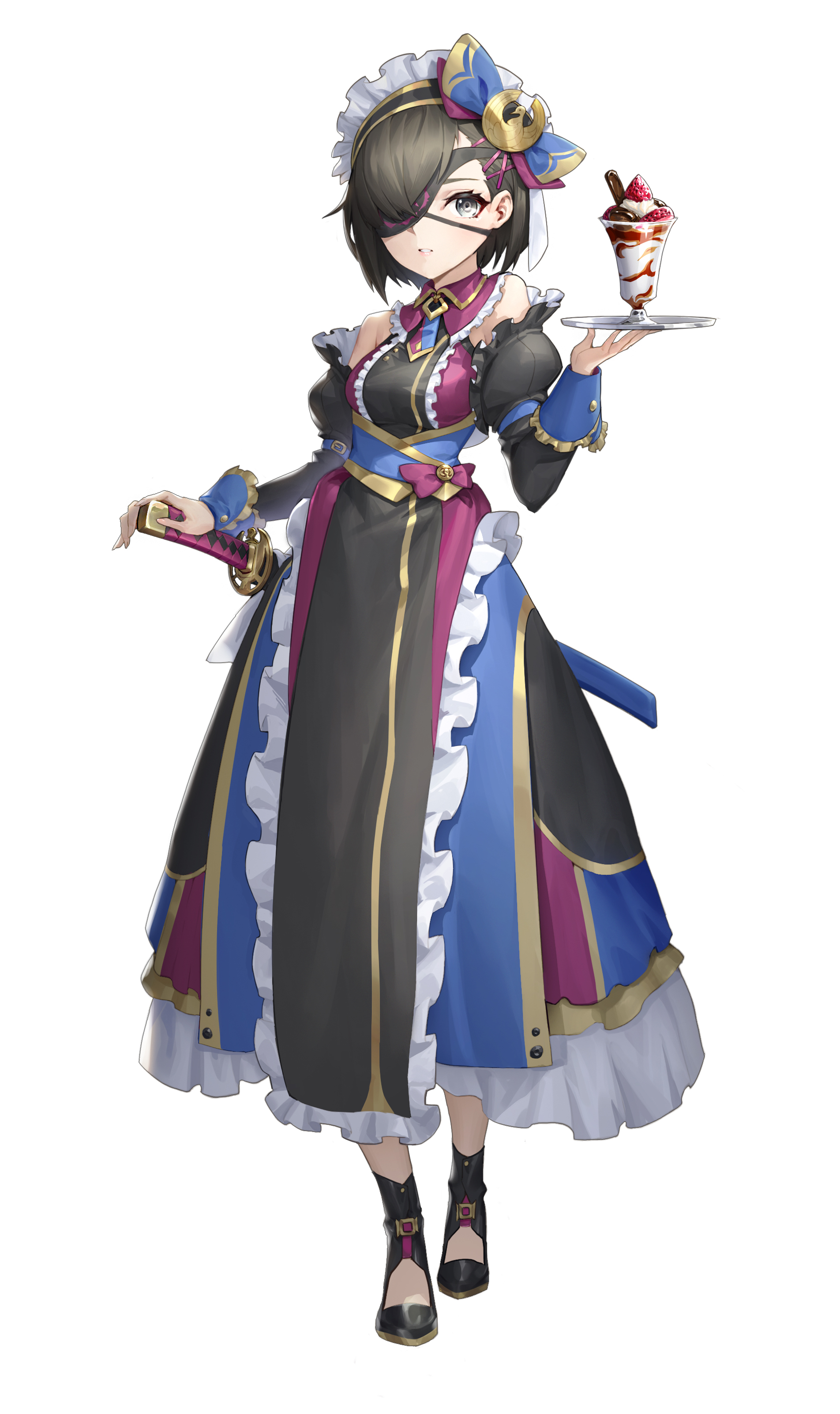 1girl absurdres alternate_costume apron black_eyes black_hair commentary_request dress eyepatch fate/grand_order fate_(series) food frills full_body hair_ornament hair_over_one_eye highres katana long_sleeves looking_at_viewer maid maid_headdress mysterious_ranmaru_x_(fate) naezy_miao parfait short_hair simple_background smile solo standing sword tray weapon white_background