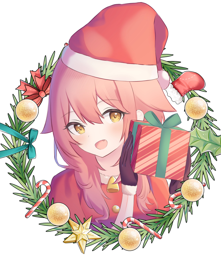 1girl :d black_gloves blush bow candy candy_cane christmas christmas_stocking christmas_wreath commentary_request cropped_torso dress fang food fur-trimmed_gloves fur_trim gift gloves hair_between_eyes hands_up hat head_tilt holding holding_gift looking_at_viewer open_mouth original pink_hair red_bow red_dress red_hat roido_(taniko-t-1218) santa_costume santa_hat simple_background smile solo star_(symbol) upper_body white_background wreath yellow_eyes