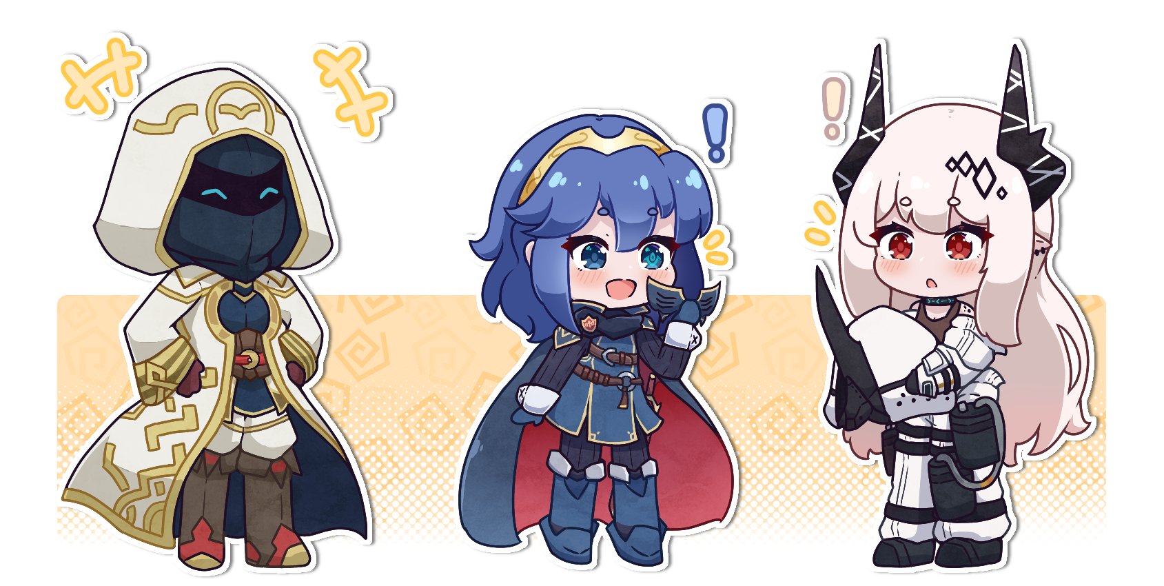 1other 2girls ambiguous_gender arknights blue_hair blush chibi commission cosplay crossover demon_girl demon_horns doctor_(arknights) fire_emblem fire_emblem_awakening fire_emblem_heroes highres hood horns kiran_(fire_emblem) kiran_(fire_emblem)_(cosplay) kurotofu laughing lucina_(fire_emblem) mask unworn_mask mudrock_(arknights) multiple_girls nintendo surprised ventoargento white_hair