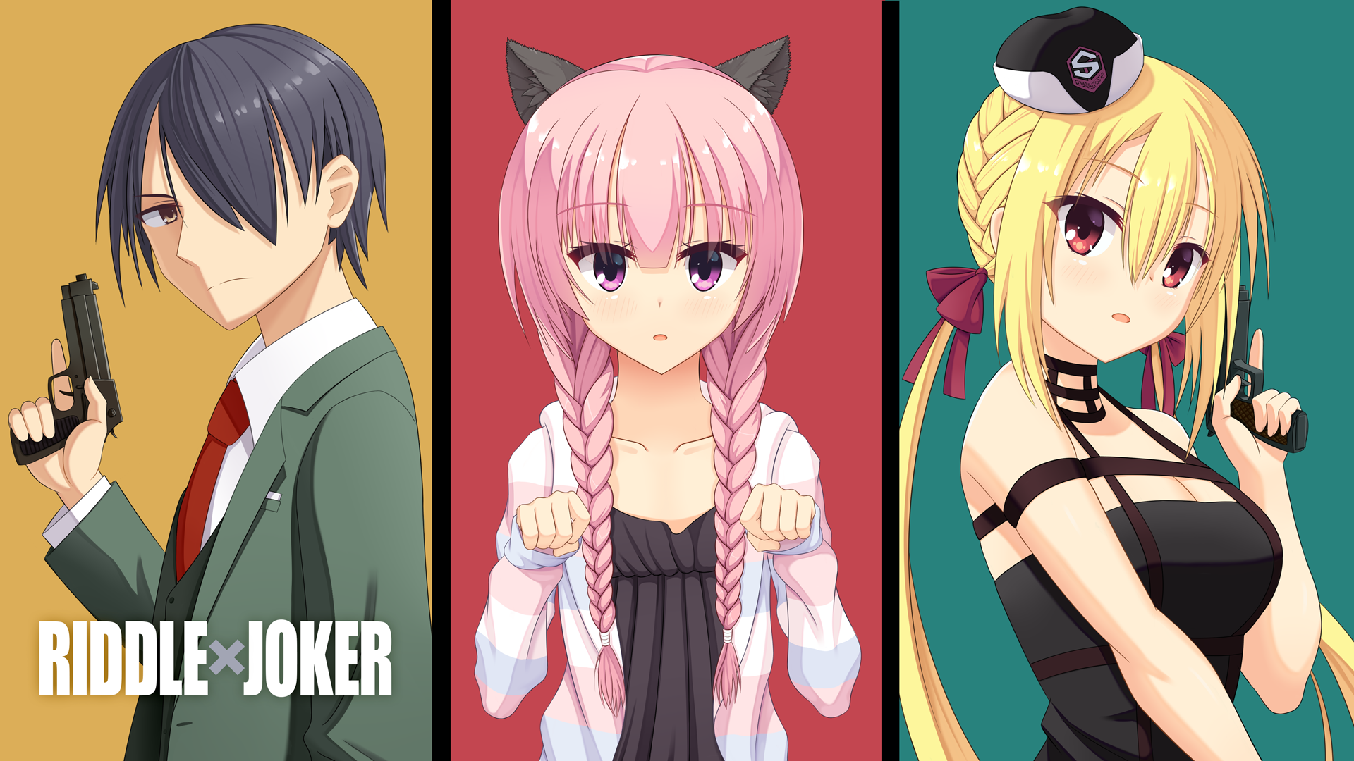 1boy 2girls animal_ears arihara_nanami arihara_satoru beret black_dress black_hair black_headwear blonde_hair blush braid breasts brown_eyes cat_ears cleavage collarbone copyright_name dress expressionless eyelashes fake_animal_ears formal_clothes fringe_trim green_background green_suit gun hair_between_eyes hair_over_one_eye hair_ribbon handgun hat highres holding holding_gun holding_weapon hood hoodie joshi_kousei large_breasts long_hair looking_at_viewer mitsukasa_ayase multicolored_hoodie multiple_girls necktie open_clothes open_mouth paw_pose pink_eyes pink_hair raised_eyebrows red_background red_eyes red_necktie red_ribbon ribbon riddle_joker school_uniform short_hair side_braid sidelocks simple_background sleeveless sleeveless_dress small_breasts spy_x_family standing suit twin_braids twintails weapon yellow_background yuzusoft