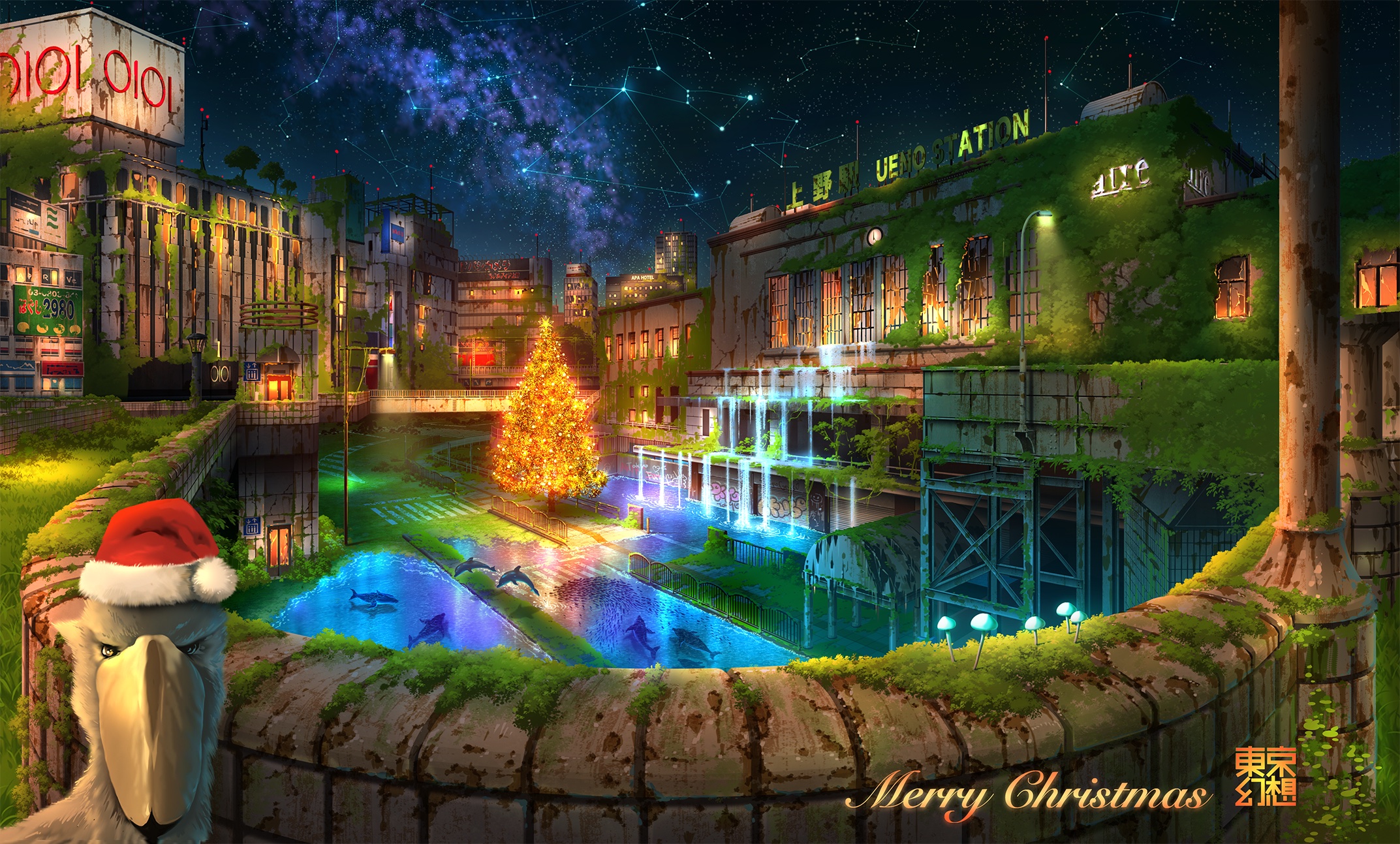 abandoned analog_clock animal artist_name bird broken_window cancer_(constellation) christmas christmas_ornaments christmas_tree clock constellation crescent_moon dilapidated dolphin elephant english_text fur-trimmed_headwear fur_trim gemini_(constellation) hat highres merry_christmas milky_way moon moss mushroom night no_humans original overgrown railing real_world_location red_headwear ruins rust santa_hat scenery shoebill sign sky star_(sky) starry_sky taitou_(tokyo) taurus_(constellation) tokyo_(city) tokyogenso train_station translation_request water window zoo