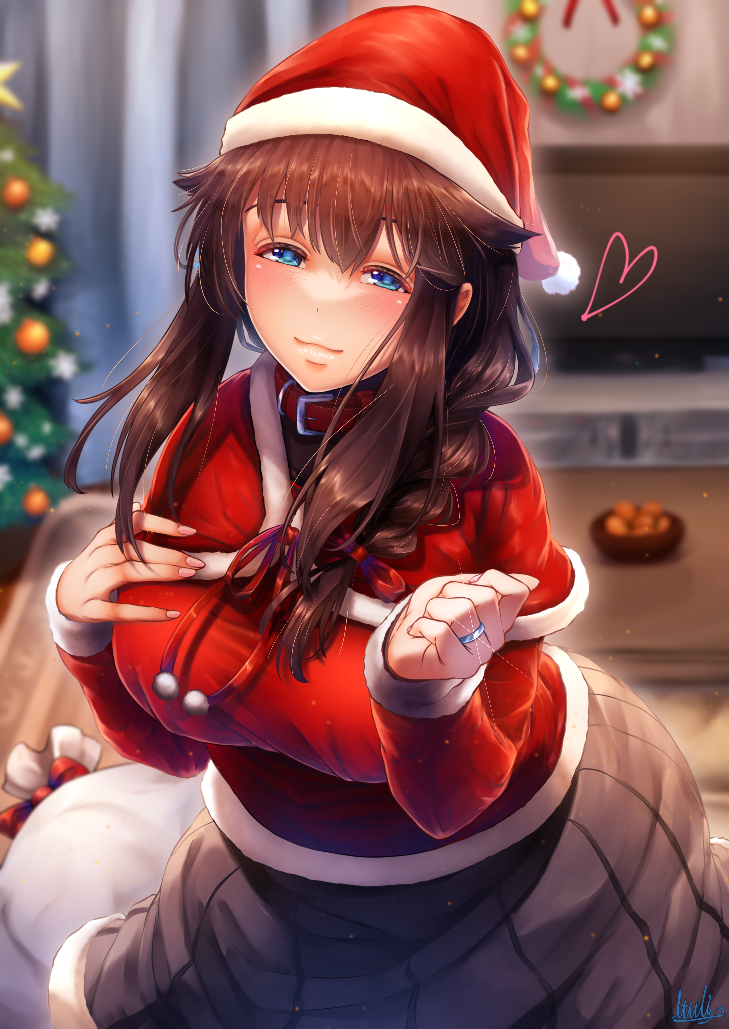 1girl absurdres ahoge alternate_costume black_skirt blue_eyes blurry blurry_background braid breasts brown_hair capelet christmas fur-trimmed_capelet fur-trimmed_headwear fur-trimmed_sleeves fur_trim hair_flaps hair_over_shoulder hat heart highres indoors jacket jewelry kantai_collection large_breasts long_sleeves medium_skirt pleated_skirt red_capelet red_hat red_jacket ring santa_hat shigure_(kancolle) shigure_kai_ni_(kancolle) single_braid skirt solo textless_version tsui_(kojiya) wedding_ring