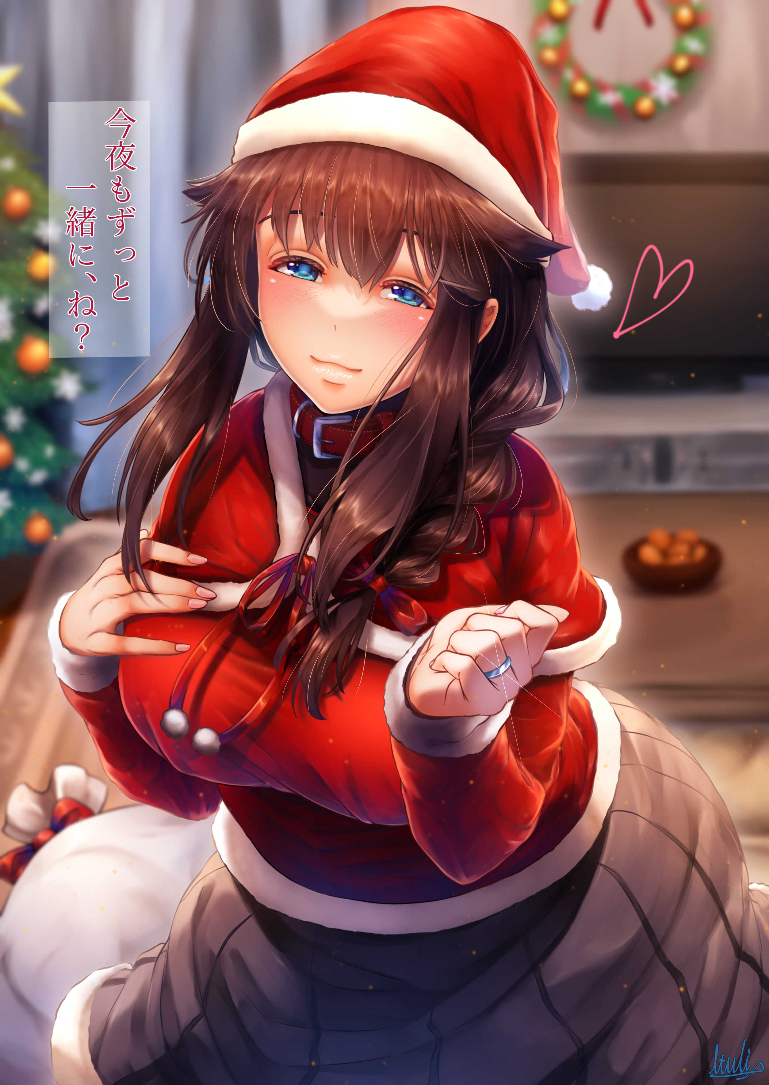 1girl absurdres ahoge alternate_costume black_skirt blue_eyes blurry blurry_background braid breasts brown_hair capelet christmas fur-trimmed_capelet fur-trimmed_headwear fur-trimmed_sleeves fur_trim hair_flaps hair_over_shoulder hat heart highres indoors jacket jewelry kantai_collection large_breasts long_sleeves medium_skirt pleated_skirt red_capelet red_hat red_jacket ring santa_hat shigure_(kancolle) shigure_kai_ni_(kancolle) single_braid skirt solo translation_request tsui_(kojiya) wedding_ring