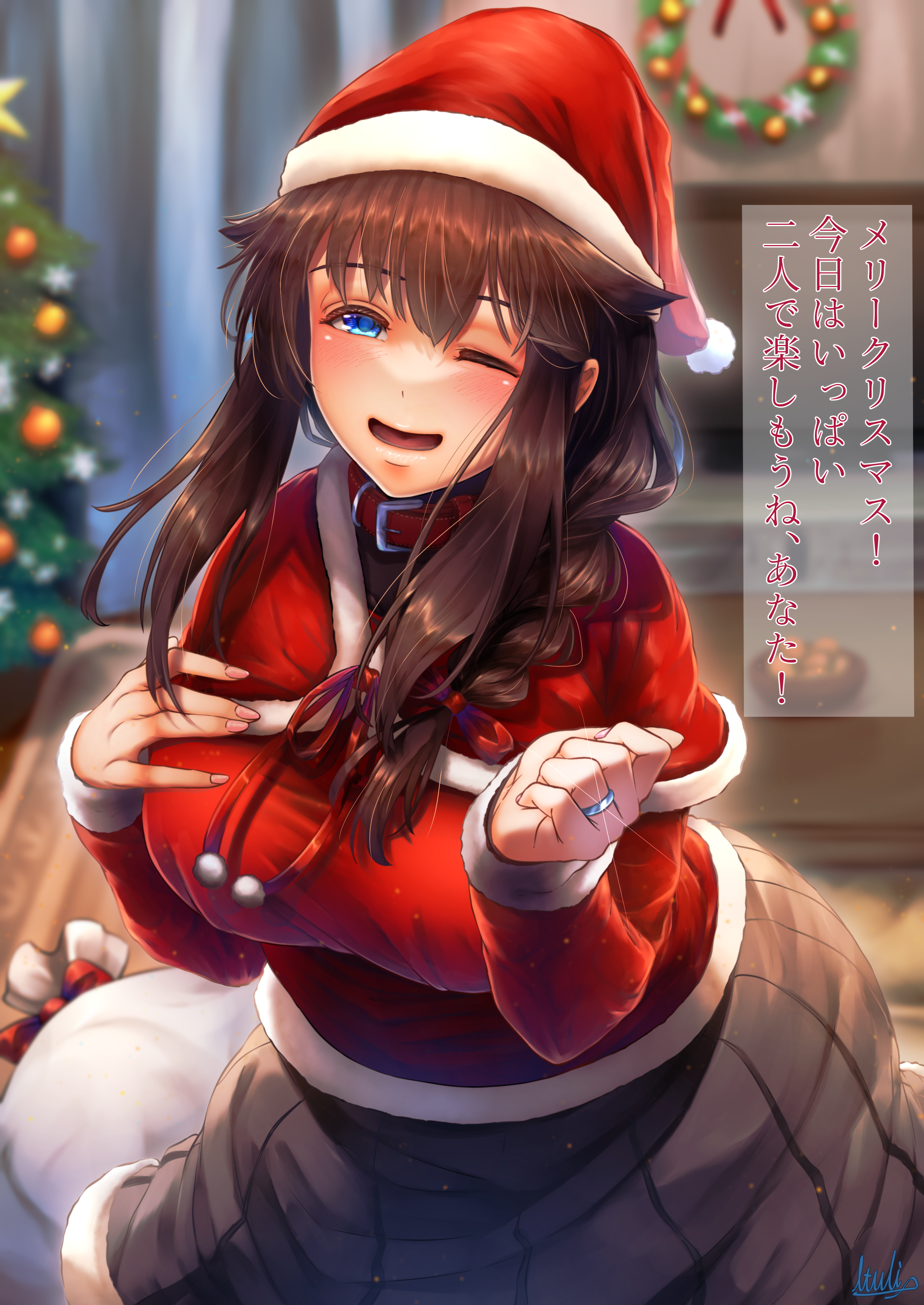 1girl absurdres ahoge alternate_costume black_skirt blue_eyes blurry blurry_background braid breasts brown_hair capelet christmas fur-trimmed_capelet fur-trimmed_headwear fur-trimmed_sleeves fur_trim hair_flaps hair_over_shoulder hat highres indoors jacket jewelry kantai_collection large_breasts long_sleeves medium_skirt one_eye_closed pleated_skirt red_capelet red_hat red_jacket ring santa_hat shigure_(kancolle) shigure_kai_ni_(kancolle) single_braid skirt solo translation_request tsui_(kojiya) wedding_ring