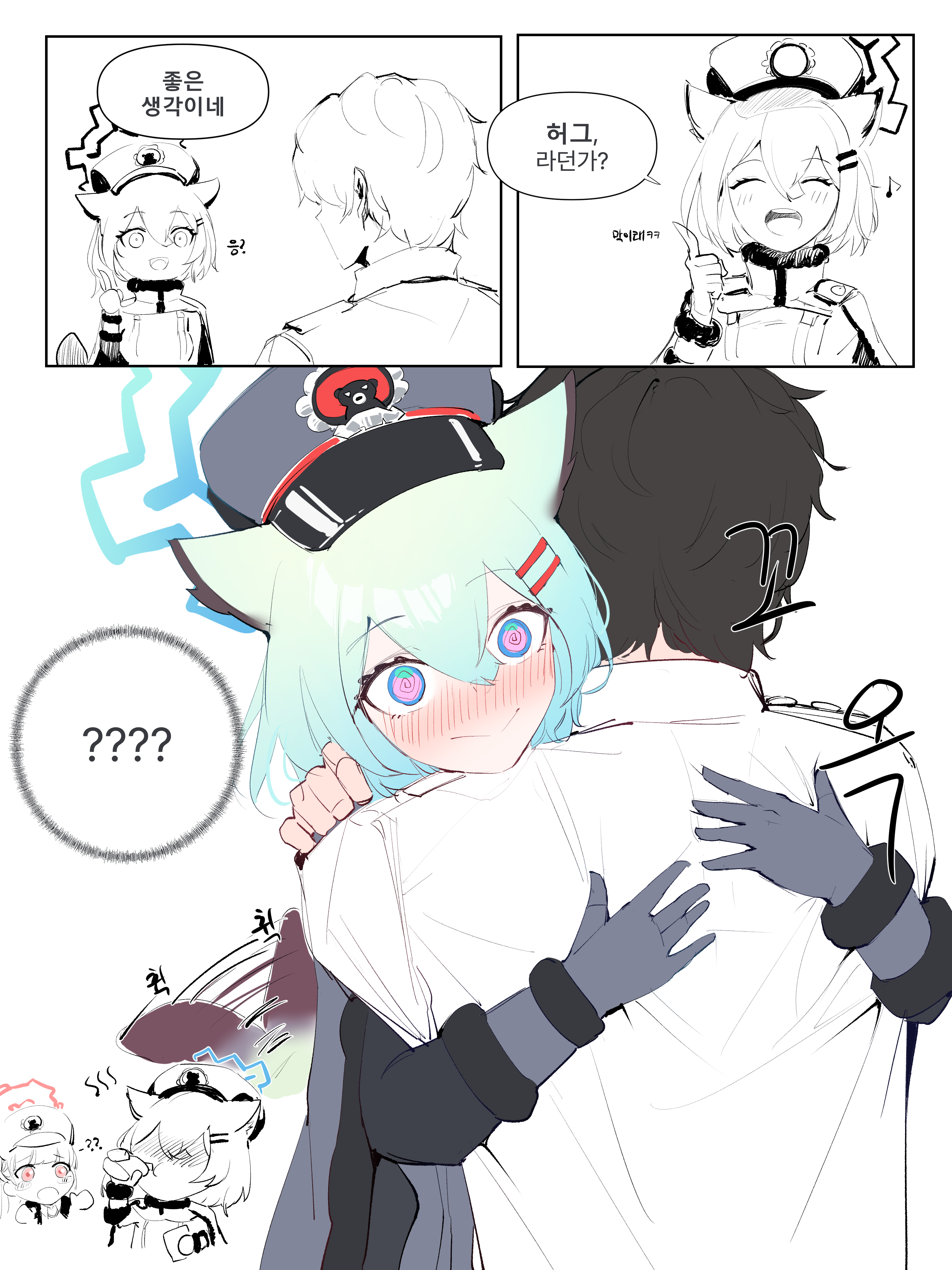 1boy 2girls ? ?? @_@ absurdres animal_ears blue_archive blue_hair blush check_translation closed_eyes closed_mouth comic drinking gloves hair_between_eyes hair_ornament hairclip halo hat highres hug index_finger_raised korean_text multiple_girls nodoka_(blue_archive) open_mouth partially_colored peaked_cap plentyofempty sensei_(blue_archive) shigure_(blue_archive) shirt smile speech_bubble spoken_question_mark translation_request weasel_ears white_shirt