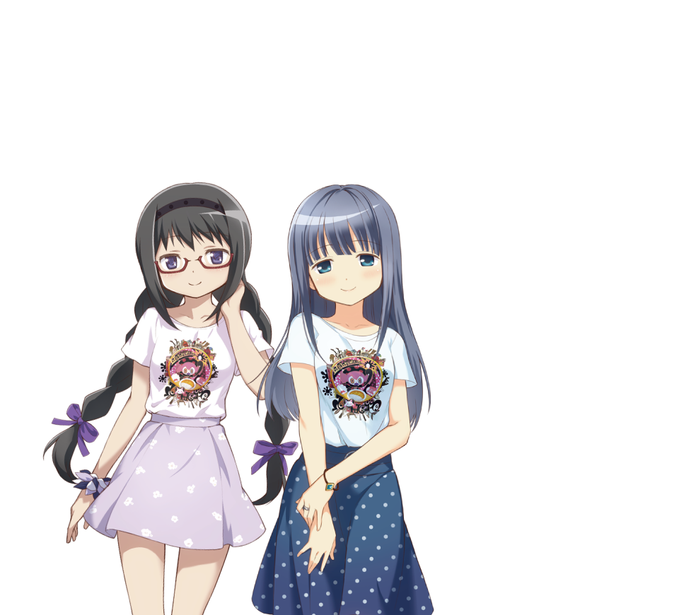 2girls akemi_homura arm_at_side black_hair black_hairband blue_eyes blue_gem blue_hair blush bracelet braid character_print charlotte_(madoka_magica) coco_ichibanya cowboy_shot dot_nose gem glasses hair_ribbon hairband hand_up jewelry long_hair looking_at_viewer magia_record:_mahou_shoujo_madoka_magica_gaiden mahou_shoujo_madoka_magica medium_skirt miniskirt multiple_girls nanami_yachiyo official_art polka_dot polka_dot_skirt print_shirt print_skirt purple_eyes purple_ribbon purple_scrunchie purple_skirt red-framed_eyewear ribbon ring scrunchie semi-rimless_eyewear shirt short_sleeves sidelocks simple_background skirt smile t-shirt transparent_background twin_braids twintails under-rim_eyewear very_long_hair white_shirt wrist_scrunchie