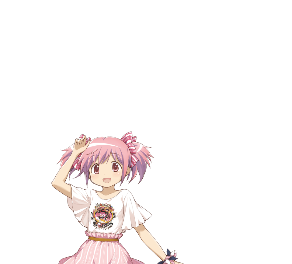 1girl :d arm_at_side arm_up blush bow character_print coco_ichibanya dot_nose hair_bow kaname_madoka looking_at_viewer magia_record:_mahou_shoujo_madoka_magica_gaiden mahou_shoujo_madoka_magica official_art open_mouth pink_bow pink_hair pink_skirt print_shirt scrunchie shirt short_hair short_sleeves simple_background skirt smile solo striped_bow striped_clothes striped_skirt swept_bangs t-shirt transparent_background twintails upper_body vertical-striped_clothes vertical-striped_skirt white_shirt wrist_scrunchie