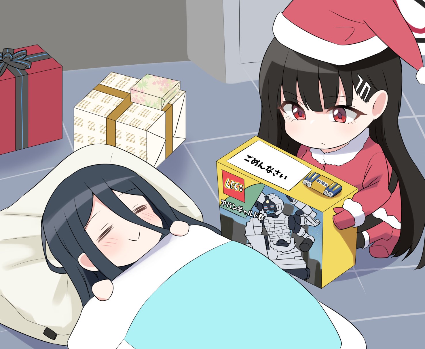 2girls alternate_costume aris_(blue_archive) avant_garde_(blue_archive) black_hair blanket blue_archive blush box closed_eyes closed_mouth gift gift_box hair_between_eyes hat highres holding holding_box lego long_hair long_hair_between_eyes long_sleeves lying mittens multiple_girls on_back pillow red_eyes red_footwear red_headwear red_mittens rio_(blue_archive) santa_costume santa_hat sashu_(thershr6s) sleeping smile squatting under_covers very_long_hair