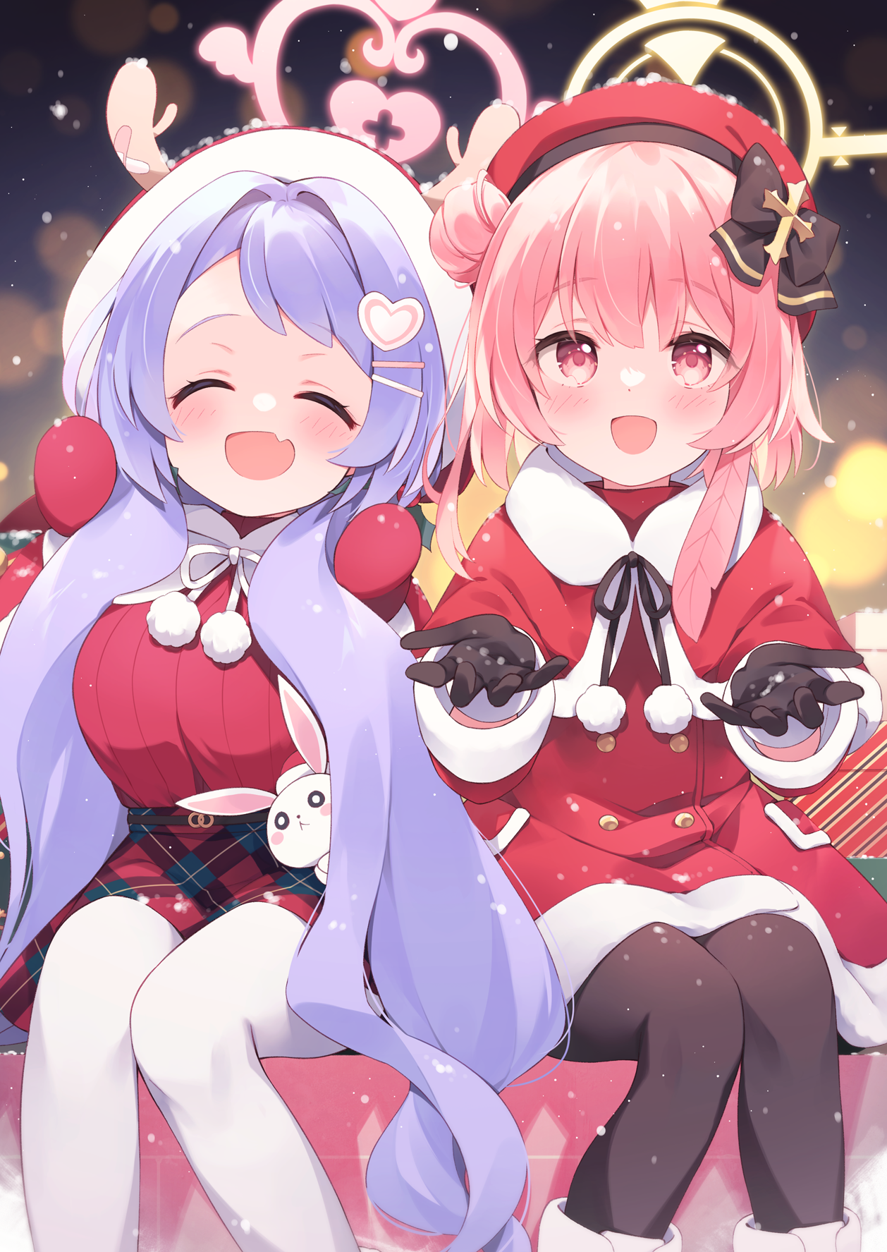 2girls :d ^_^ beret black_gloves black_pantyhose blue_archive blush christmas closed_eyes dress fang gloves hair_ornament halo hanae_(blue_archive) hanae_(christmas)_(blue_archive) hat heart heart_hair_ornament highres kano_hito long_hair looking_at_viewer multiple_girls official_alternate_costume open_mouth pantyhose pink_eyes purple_hair red_dress red_gloves red_headwear santa_costume serina_(blue_archive) serina_(christmas)_(blue_archive) sitting skin_fang smile snow white_pantyhose