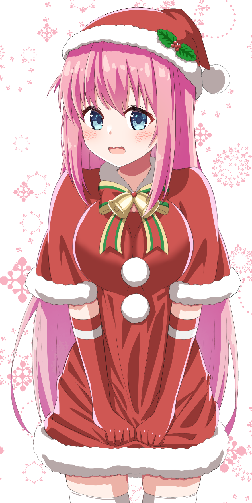 1girl bad_id bad_pixiv_id bell blue_eyes blush bocchi_the_rock! bow capelet commentary_request dress elbow_gloves fur-trimmed_capelet fur-trimmed_dress fur-trimmed_headwear fur_trim gloves gotoh_hitori hair_between_eyes hat highres long_hair looking_at_viewer nenosame open_mouth pink_hair red_capelet red_dress red_gloves red_hat santa_costume santa_hat simple_background skindentation solo striped_bow thighhighs very_long_hair wavy_mouth white_background white_thighhighs