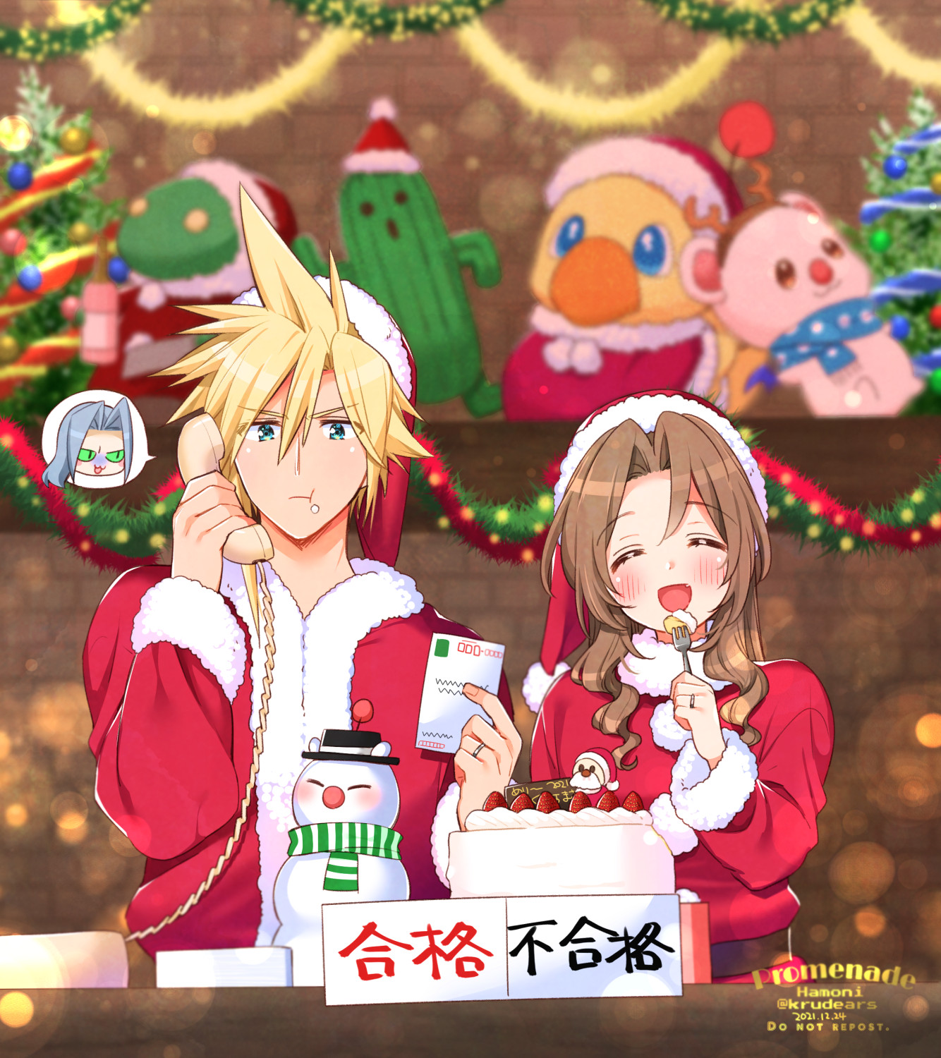 1girl 2boys aerith_gainsborough aqua_eyes blonde_hair blush brown_hair cake chocobo christmas_cake christmas_ornaments christmas_tree closed_eyes cloud_strife coat dated final_fantasy final_fantasy_vii final_fantasy_vii_remake food food_on_face fork fruit full_mouth fur-trimmed_coat fur-trimmed_headwear fur_trim garland_(decoration) grey_hair hair_between_eyes highres holding holding_fork holding_phone krudears long_hair long_sleeves looking_at_viewer moogle multiple_boys open_mouth parted_bangs parted_lips phone red_coat red_headwear sabotender santa_costume sephiroth short_hair sidelocks slit_pupils smile spiked_hair square_enix strawberry talking_on_phone tonberry twitter_username wavy_hair