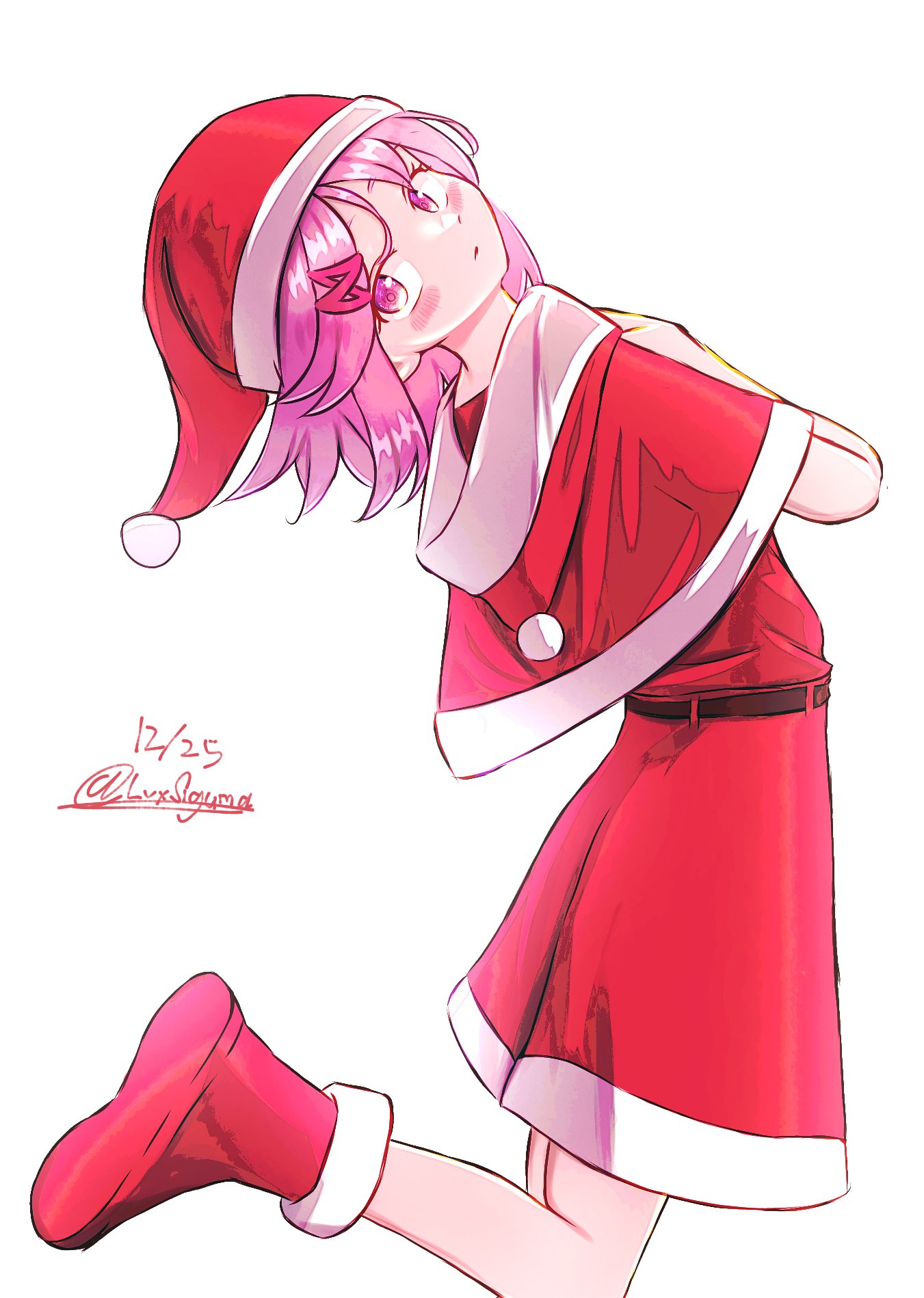 1girl belt blush boots brown_belt capelet dated doki_doki_literature_club dress foot_up fur-trimmed_capelet fur-trimmed_dress fur-trimmed_headwear fur_trim hair_ornament hairclip hands_up hat highres leaning_back looking_back lvxsiguma natsuki_(doki_doki_literature_club) pink_eyes pink_hair pom_pom_(clothes) red_capelet red_dress red_hat red_hood santa_boots santa_costume santa_dress santa_hat short_hair sidelocks solo twitter_username white_background
