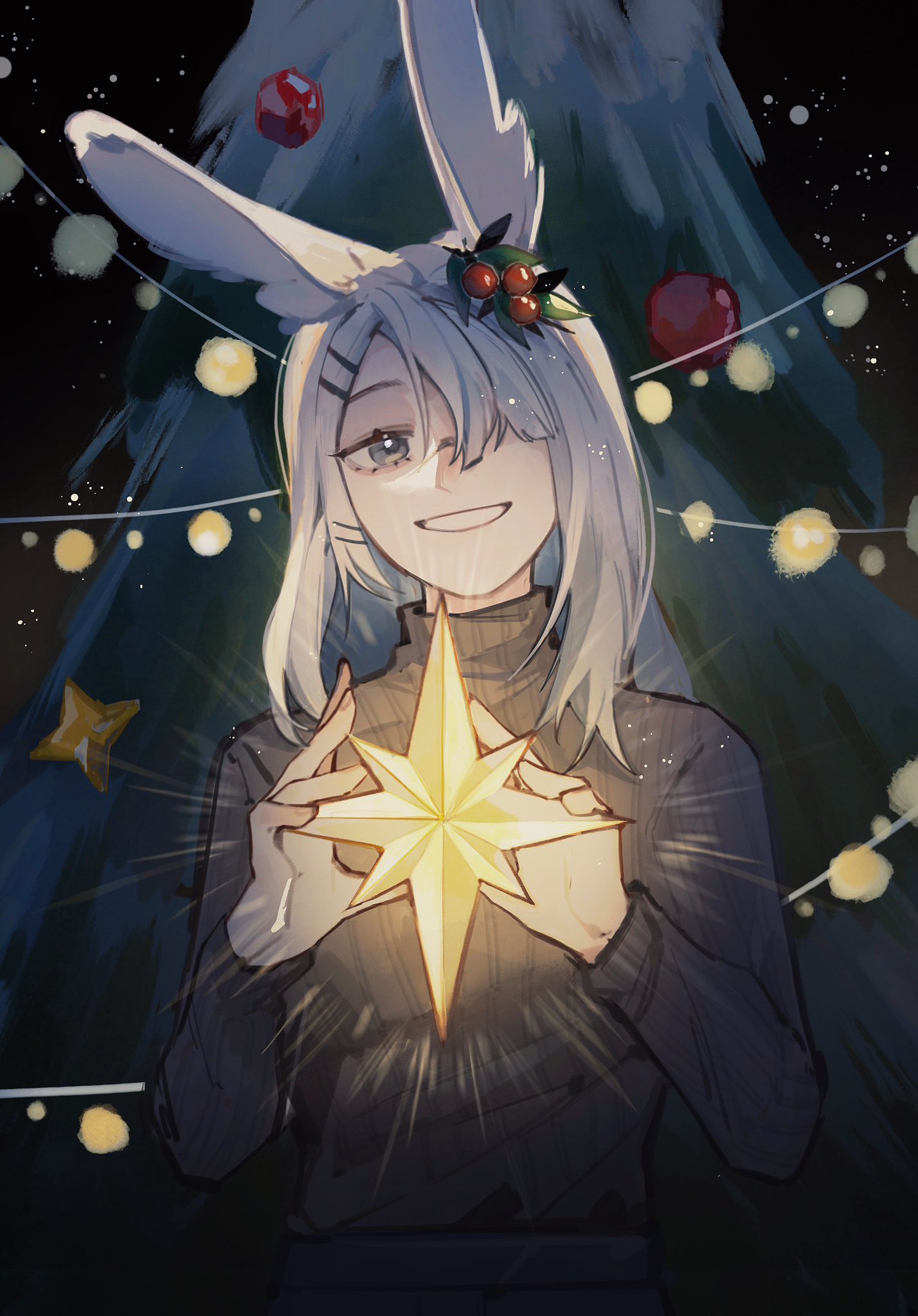 1girl animal_ears arknights black_sweater christmas christmas_ornaments christmas_tree commentary english_commentary frostnova_(arknights) grey_eyes grey_hair grin hair_ornament hair_over_one_eye hairclip hands_up highres holding long_hair long_sleeves looking_at_viewer rabbit_ears resul_(scripppppp) ribbed_sweater smile solo sweater turtleneck turtleneck_sweater