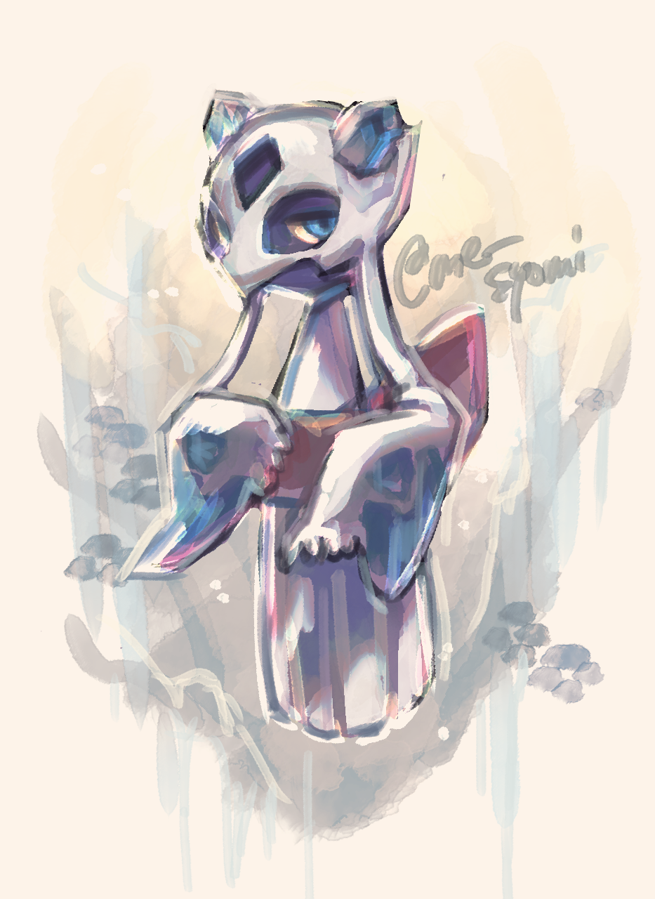 artist_name back_bow blue_eyes blue_gem bow colored_sclera floating froslass full_body gem gen_4_pokemon half-closed_eyes hands_up highres ice looking_at_viewer me_syomi nintendo no_humans pokemon pokemon_(creature) red_bow signature sketch solo twitter_username yellow_sclera
