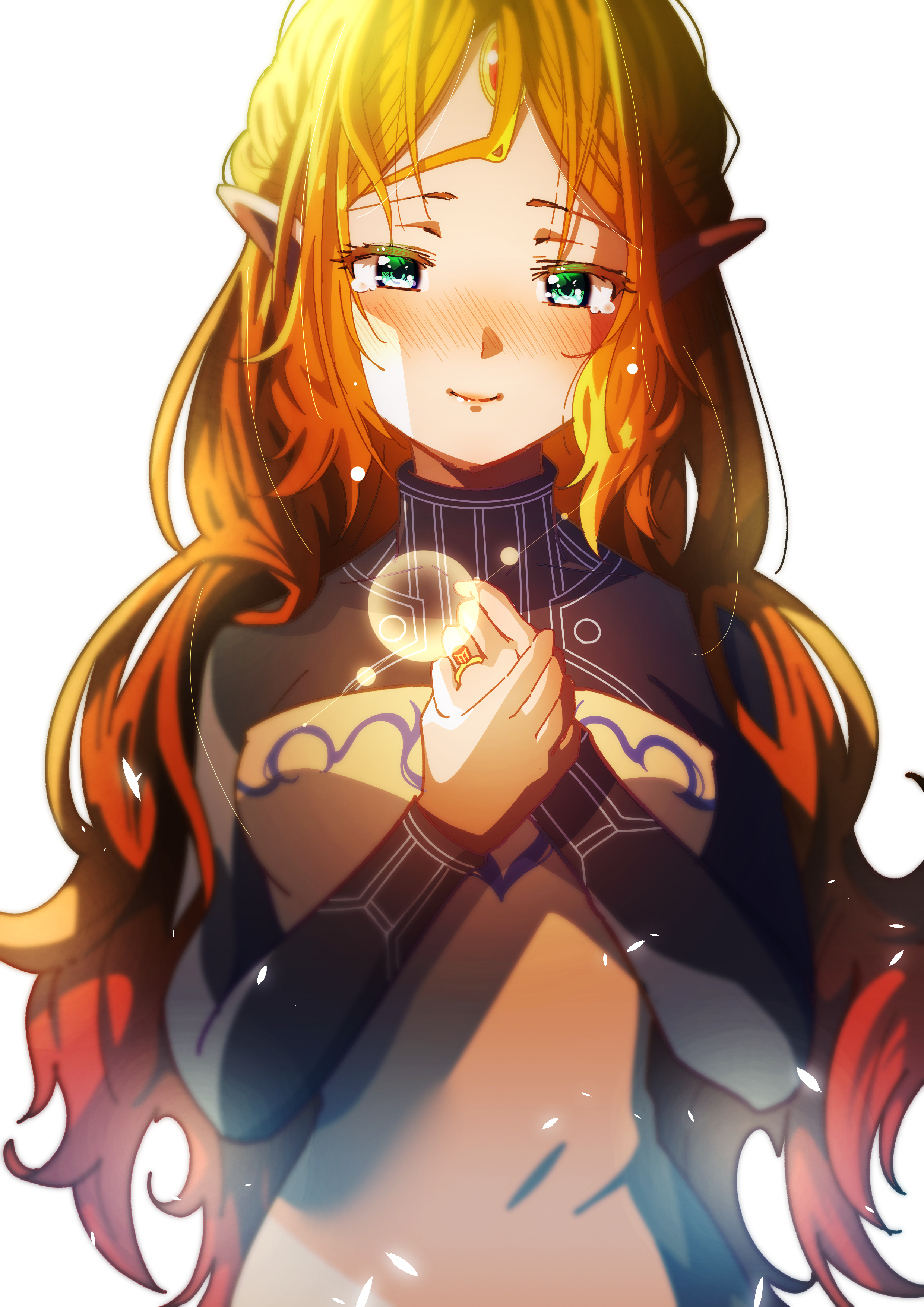 1girl absurdres black_bodysuit blonde_hair blush bodysuit breasts brown_dress cruzango0510 dress elf forehead_jewel glint green_eyes highres isekai_ojisan jewelry long_hair looking_at_viewer medium_breasts orange_hair own_hands_together pointy_ears ring simple_background smile solo sui_(isekai_ojisan) tearing_up turtleneck turtleneck_bodysuit upper_body very_long_hair white_background