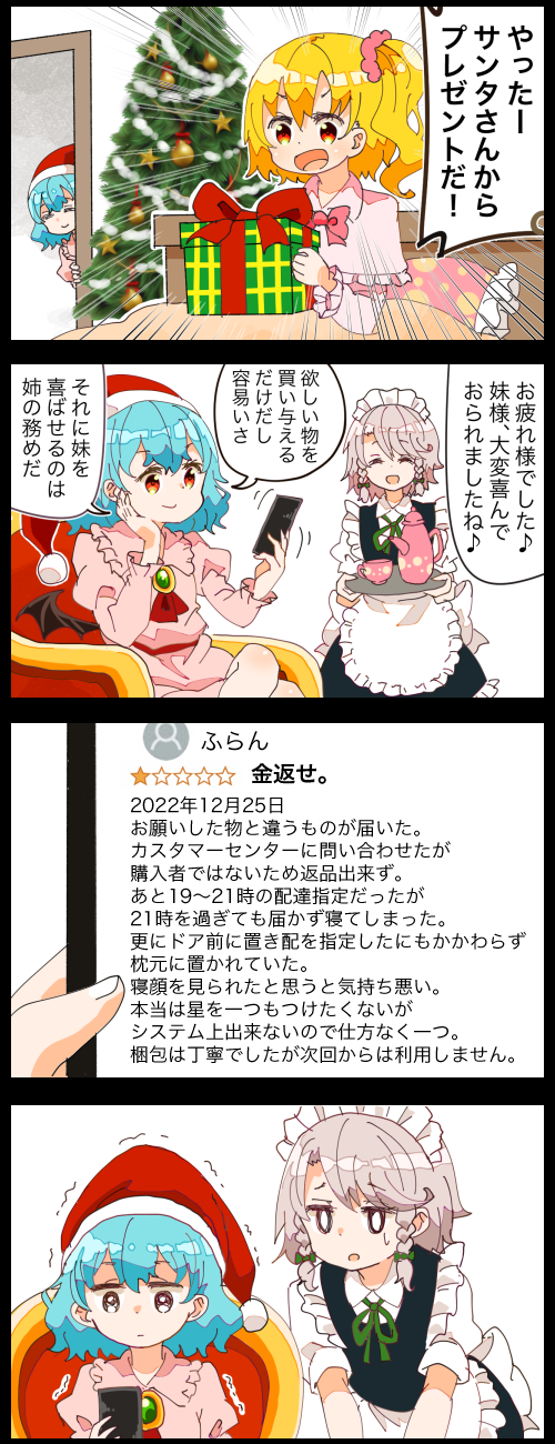 3girls 4koma amazon_(company) bed blanket cellphone chair christmas_tree comic cup flandre_scarlet gift hat highres izayoi_sakuya jetto_komusou multiple_girls pajamas phone pillow pink_pajamas remilia_scarlet santa_hat saucer smartphone teacup teapot touhou