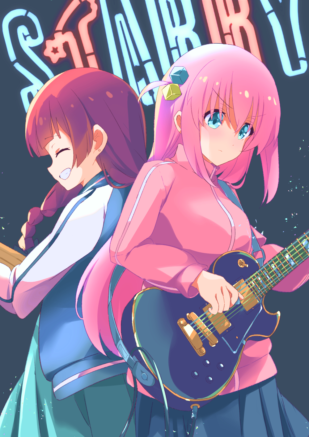 2girls ^_^ back-to-back blue_eyes blue_skirt bocchi_the_rock! braid breasts closed_eyes closed_mouth cube_hair_ornament electric_guitar gotoh_hitori grin guitar guraasan hair_between_eyes hair_ornament highres hiroi_kikuri holding holding_instrument instrument jacket long_hair long_sleeves medium_breasts multiple_girls neon_lights one_side_up pink_hair pink_jacket pleated_skirt profile puffy_long_sleeves puffy_sleeves red_hair single_braid skirt smile track_jacket v-shaped_eyebrows very_long_hair