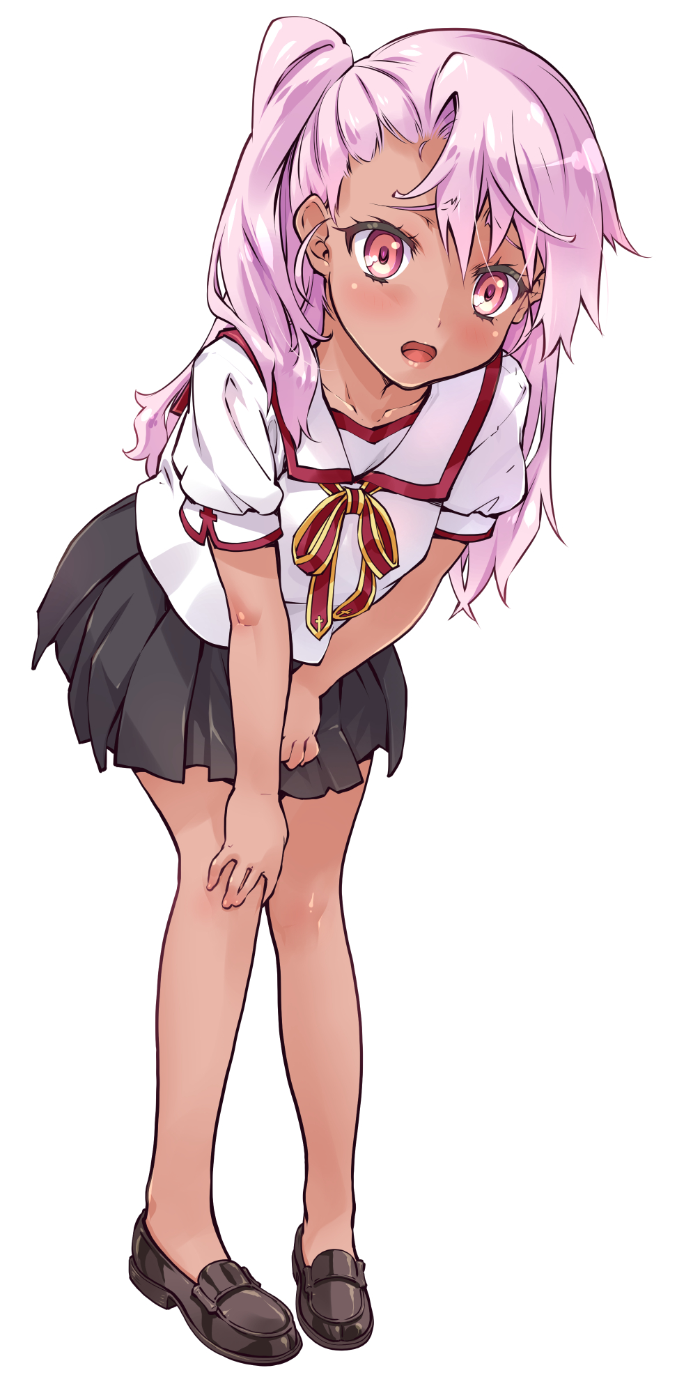 1girl black_shoes blush chloe_von_einzbern dark-skinned_female dark_skin fate/kaleid_liner_prisma_illya fate_(series) full_body highres loafers long_hair looking_at_viewer open_mouth pink_eyes pink_hair pleated_skirt school_uniform shoes side_ponytail simple_background skirt solo suzuki24 white_background