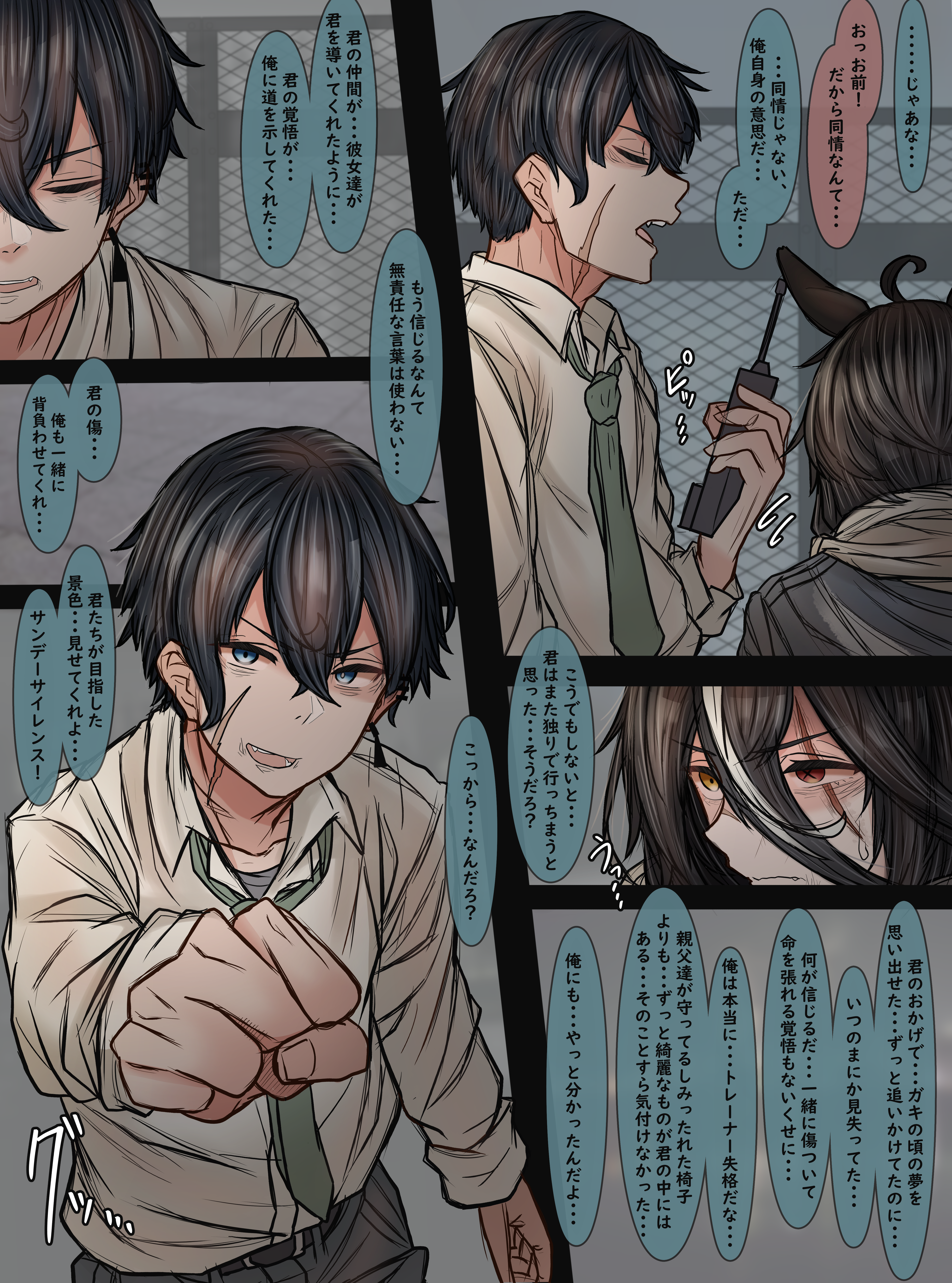 1boy 1girl absurdres ahoge animal_ears arthur_b._hancock_iii black_hair black_jacket blue_eyes cellphone chain-link_fence clenched_hand closed_eyes collared_shirt comic earrings facial_scar fence flying_sweatdrops genderswap genderswap_(mtf) green_necktie hair_between_eyes heterochromia highres hood hooded_jacket horse_ears horse_girl jacket jewelry leogust long_bangs long_hair long_sleeves looking_at_viewer multicolored_hair necktie open_mouth original outside_border personification phone red_eyes scar scar_across_eye scar_on_cheek scar_on_face shirt short_hair single_earring speech_bubble streaked_hair sunday_silence_(racehorse) sweatdrop translation_request two-tone_hair umamusume v-shaped_eyebrows white_hair white_hood white_shirt yellow_eyes