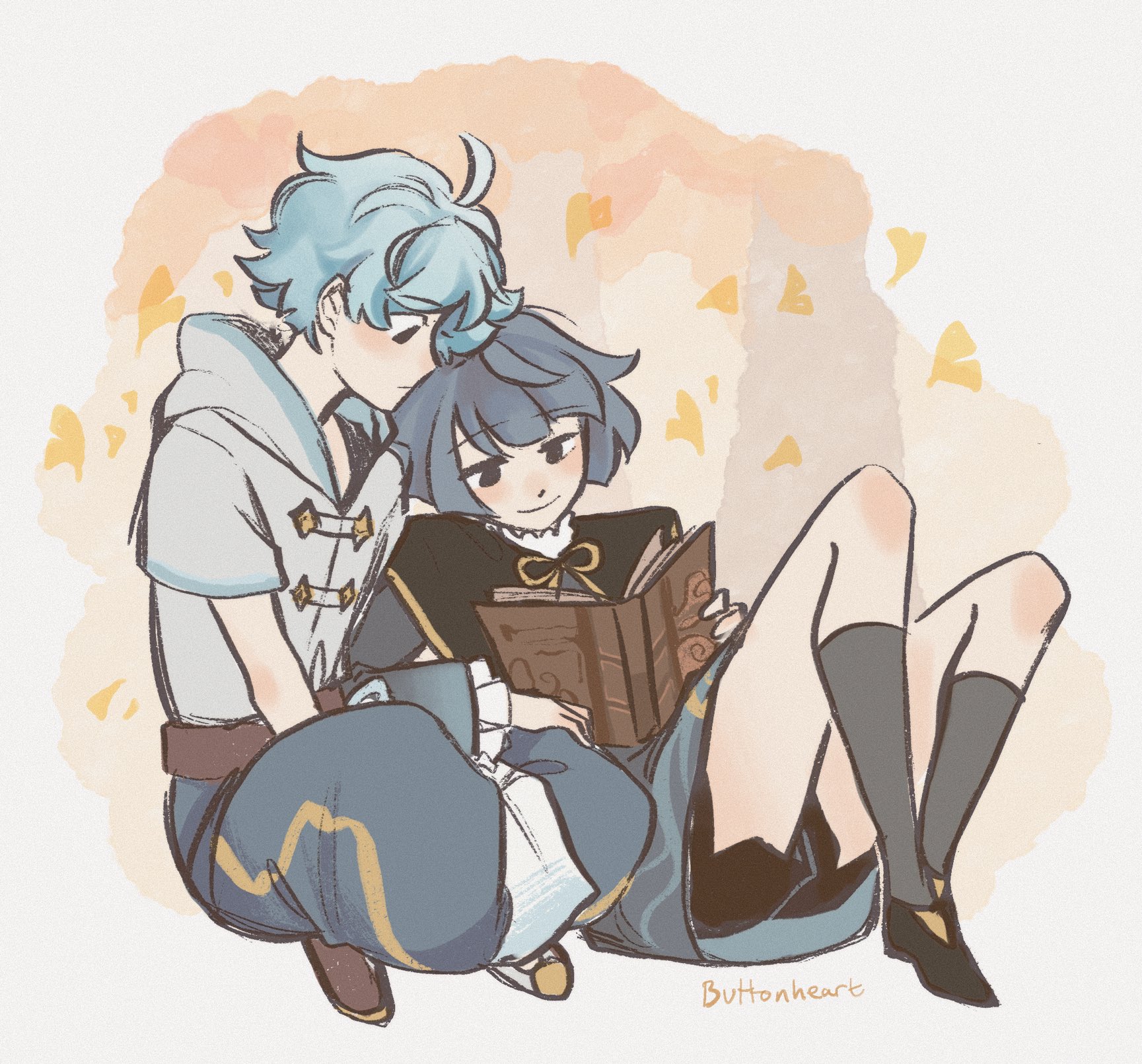 2boys bishounen blue_hair book buttonheart chinese_clothes chongyun_(genshin_impact) commentary couple english_commentary frilled_shirt_collar frilled_sleeves frills genshin_impact highres long_sleeves looking_at_object male_focus multiple_boys on_floor reading short_hair simple_background sitting smile xingqiu_(genshin_impact)