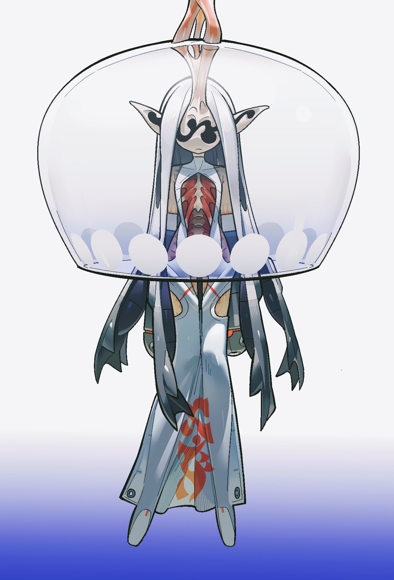 1girl arms_at_sides azurec66 black_hair blue_background commentary english_commentary exposed_muscle full_body gradient_background gradient_hair highres long_hair multicolored_hair no_eyes original personification pointy_ears solo spine two-tone_hair very_long_hair white_background white_hair wind_chime