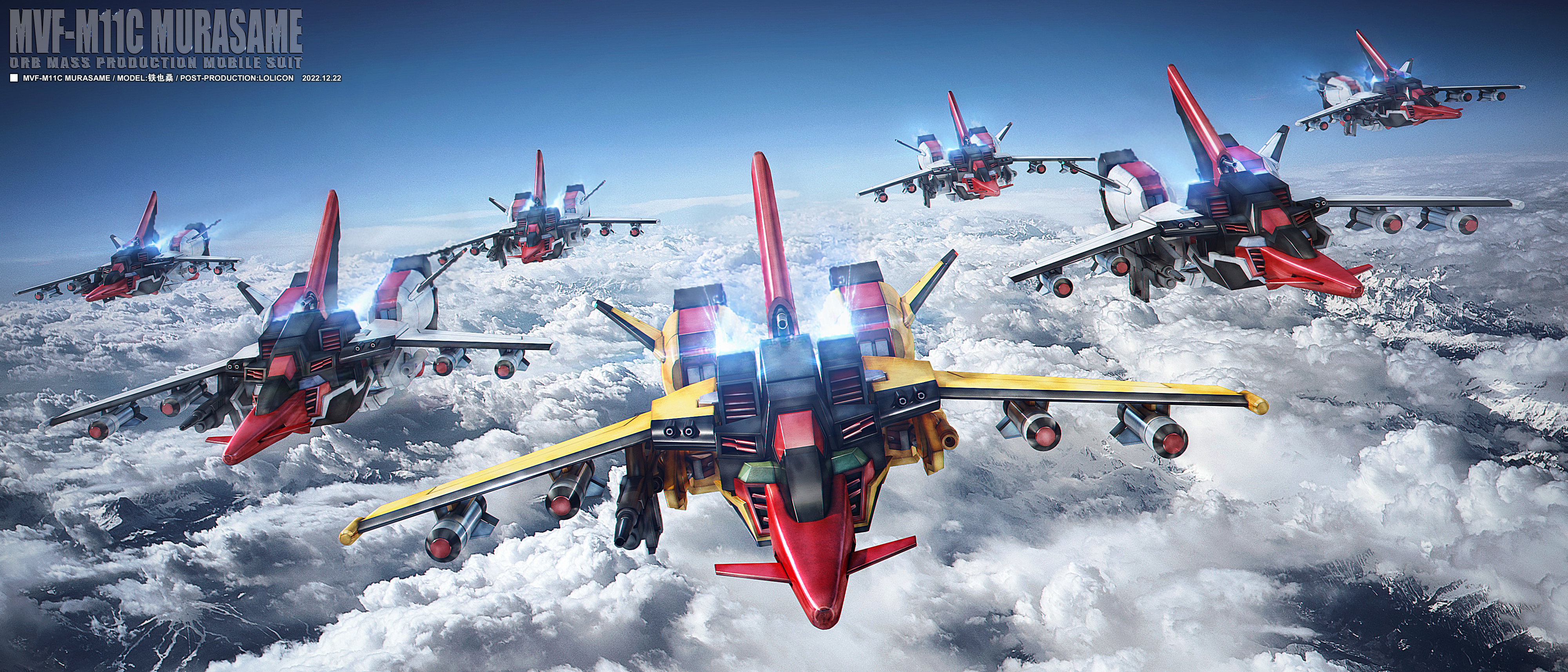absurdres aircraft airplane beam_rifle canopy_(aircraft) cloud energy_gun flying gundam gundam_seed gundam_seed_destiny highres lolicon_(lolicon42051636) missile mountain murasame_(gundam_seed_destiny) no_humans photoshop_(medium) science_fiction snow vehicle_focus vehicle_name weapon