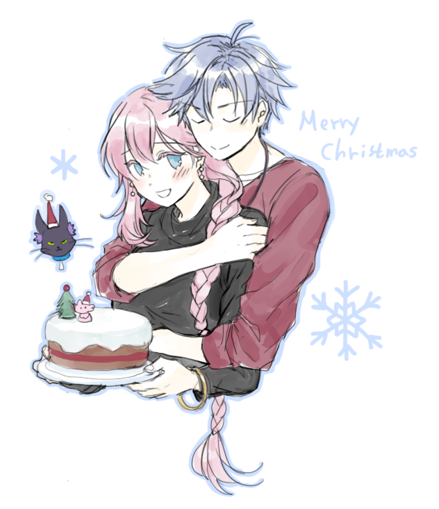 1boy 1girl black_hair blue_eyes bracelet braid cake cat celine_(eiyuu_densetsu) closed_eyes eiyuu_densetsu emma_millstein falcom food holding holding_food hug hugged_from_behind jewelry long_hair long_sleeves merry_christmas open_mouth rean_schwarzer sen_no_kiseki_(series) sen_no_kiseki_i short_hair simple_background single_braid snowflakes spiked_hair white_background wolfyinthecity