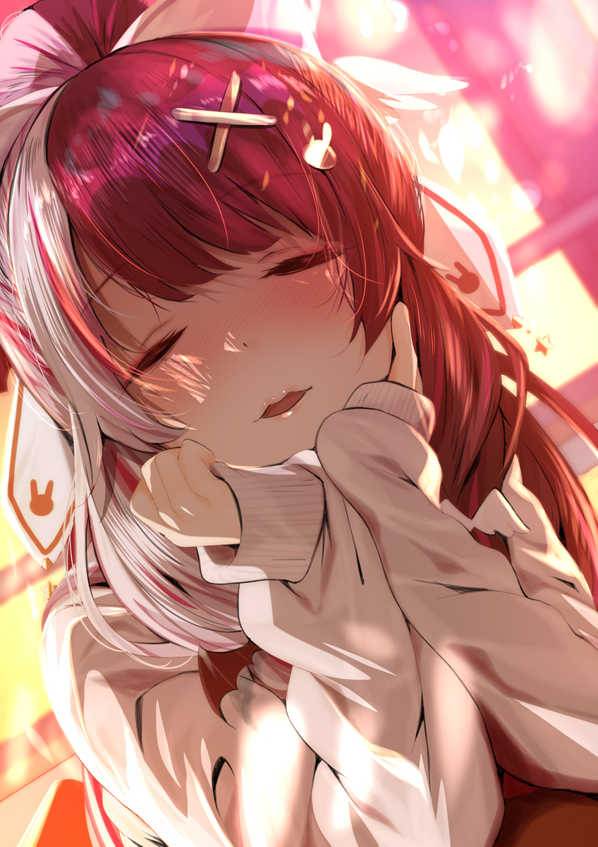 1girl bad_id bad_twitter_id blush closed_eyes commentary day facing_viewer fumihiko_(fu_mihi_ko) hair_ornament hairpin hands_on_own_cheeks hands_on_own_face highres long_hair long_sleeves multicolored_hair nijisanji open_mouth ponytail red_hair sleeves_past_wrists solo split-color_hair sweater virtual_youtuber white_hair white_sweater yorumi_rena yorumi_rena_(9th_costume)
