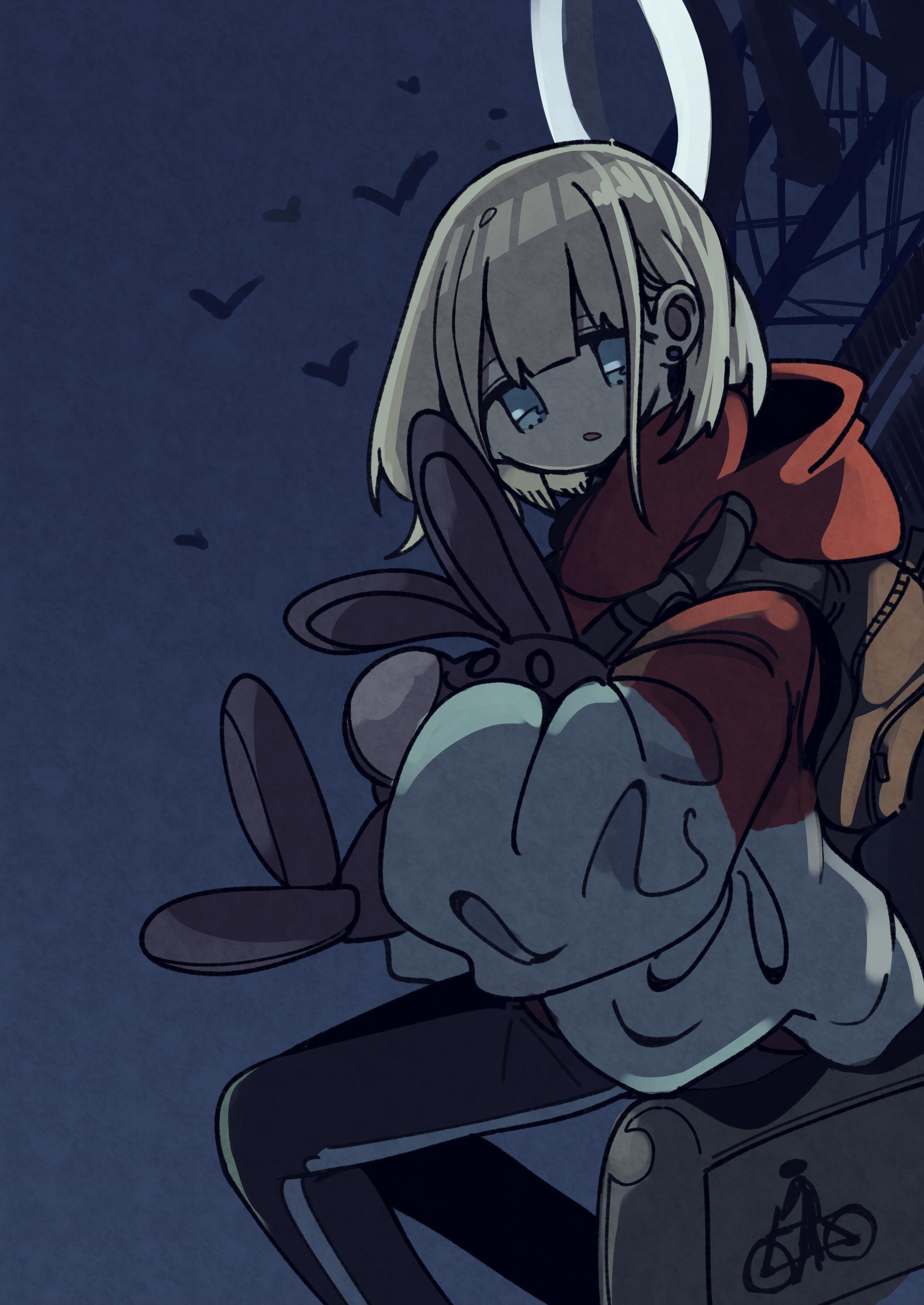 1girl a9mer absurdres backpack bag bird black_leggings blue_eyes blunt_bangs bob_cut brown_bag ear_piercing expressionless feet_out_of_frame flock fluorescent_lamp highres holding holding_stuffed_toy holding_to_chest idolmaster idolmaster_shiny_colors jacket knees_together_feet_apart leggings light_brown_hair looking_at_viewer multicolored_jacket night open_mouth piercing red_jacket serizawa_asahi short_hair sign silhouette sitting solo stuffed_animal stuffed_rabbit stuffed_toy turning_head white_jacket