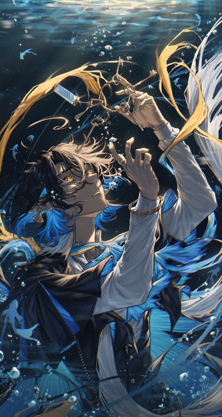 1boy ahoge air_bubble arknights ascot black_cape black_hair black_vest blue_ascot blue_hair blue_theme bracelet bubble cape collared_shirt colored_inner_hair earrings fish glowing glowing_eyes hair_between_eyes hands_up highres jewelry key keyring looking_up lumen_(arknights) lux_arts male_focus multicolored_hair open_collar parted_lips pointy_ears ring shell shell_earrings shirt short_hair solo underwater upper_body vest white_shirt yellow_eyes