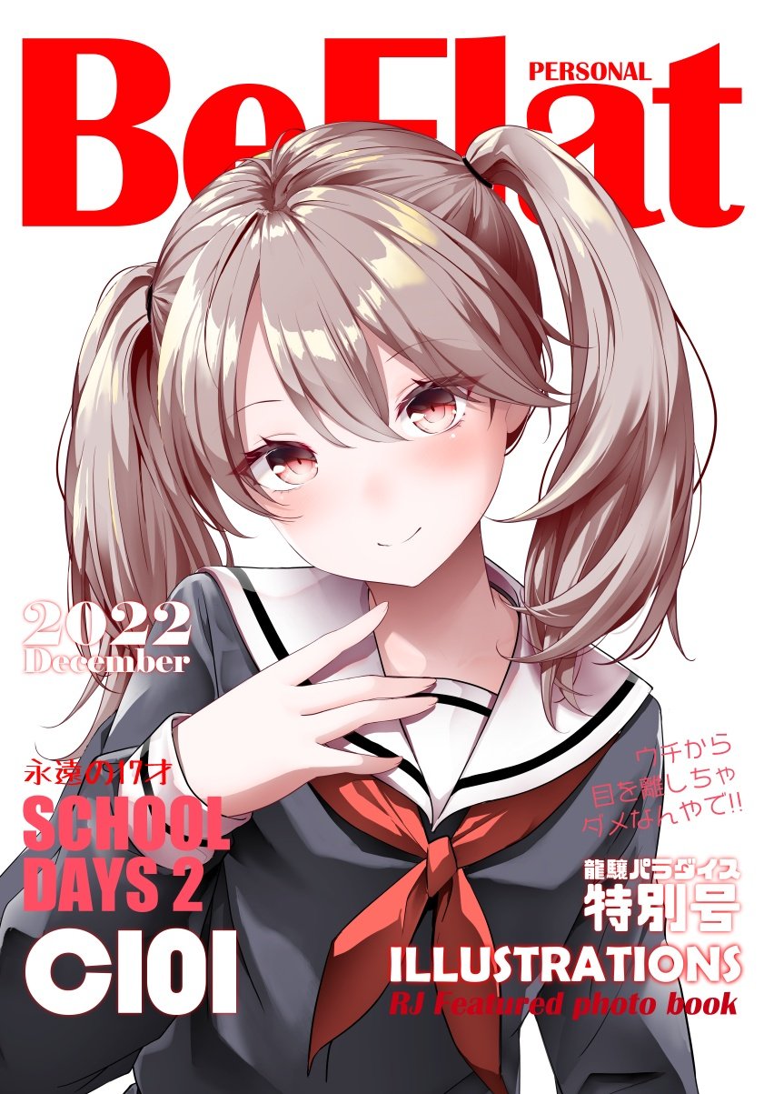 1girl alternate_costume black_serafuku black_shirt brown_eyes brown_hair commentary_request cover cover_page fake_cover fake_magazine_cover highres kantai_collection kirigakure_(kirigakure_tantei_jimusho) long_hair magazine_cover neckerchief red_neckerchief ryuujou_(kancolle) sailor_collar school_uniform serafuku shirt simple_background smile solo translation_request twintails upper_body white_background white_sailor_collar