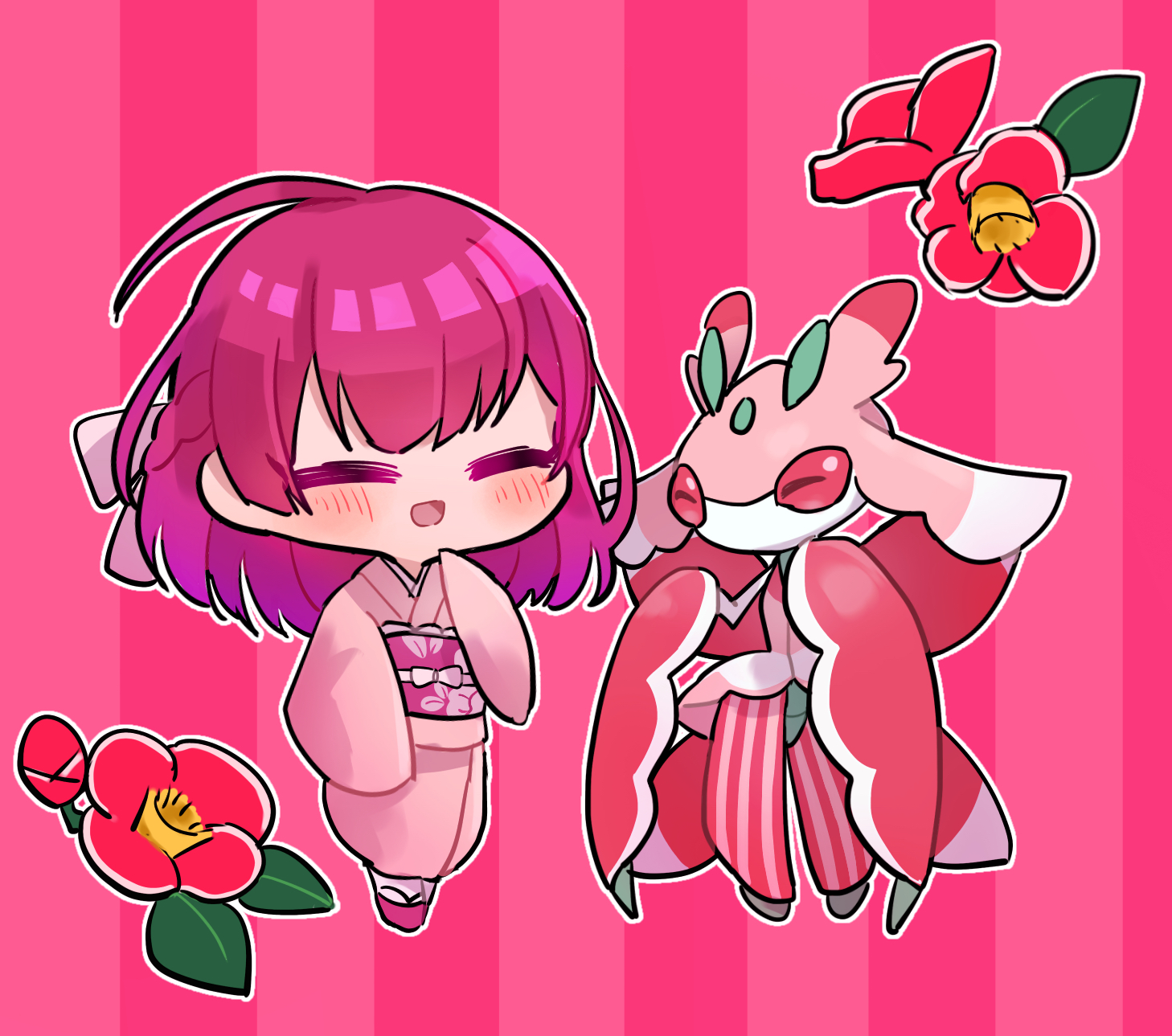1girl :d ahoge arm_at_side blush bow braid chibi closed_eyes crossover floral_print flower full_body gen_7_pokemon hair_bow hand_up highres japanese_clothes kimono leaf lurantis magia_record:_mahou_shoujo_madoka_magica_gaiden mahou_shoujo_madoka_magica medium_hair nintendo obi okobo open_mouth outline pink_background pink_flower pink_hair pink_kimono platform_sandals pokemon pokemon_(creature) print_sash sandals sash side_braid smile socks solo striped_background takenoko_mgrc tokiwa_nanaka vertical_stripes very_long_sleeves white_bow white_outline white_socks