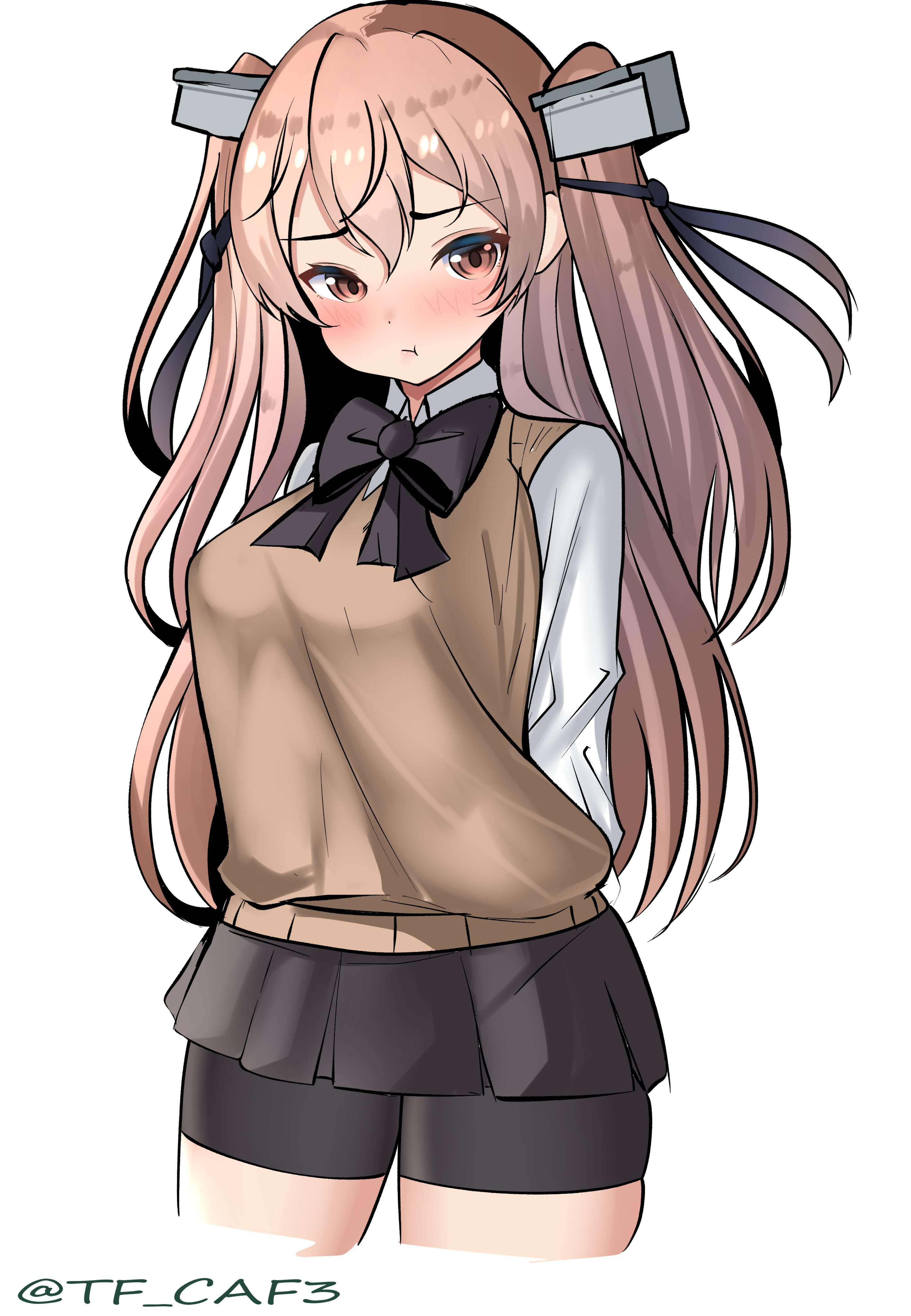 1girl :t absurdres arms_behind_back bike_shorts bike_shorts_under_skirt black_ribbon black_skirt blush breasts brown_eyes brown_hair cropped_legs hair_ribbon highres johnston_(kancolle) kantai_collection long_hair looking_at_viewer medium_breasts miniskirt one-hour_drawing_challenge pout ribbon shirt simple_background skirt solo sweater_vest tf_cafe twitter_username two_side_up white_background